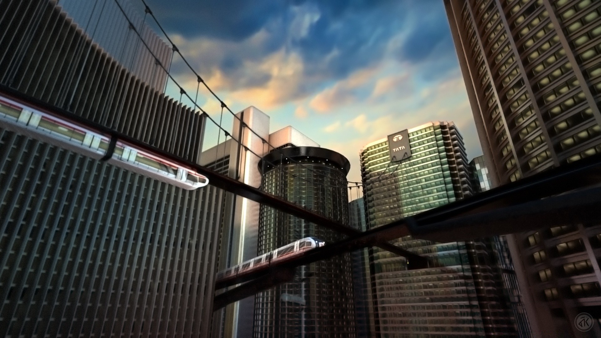 Eine Brücke mit einem fahrenden Zug in einer Stadtlandschaft