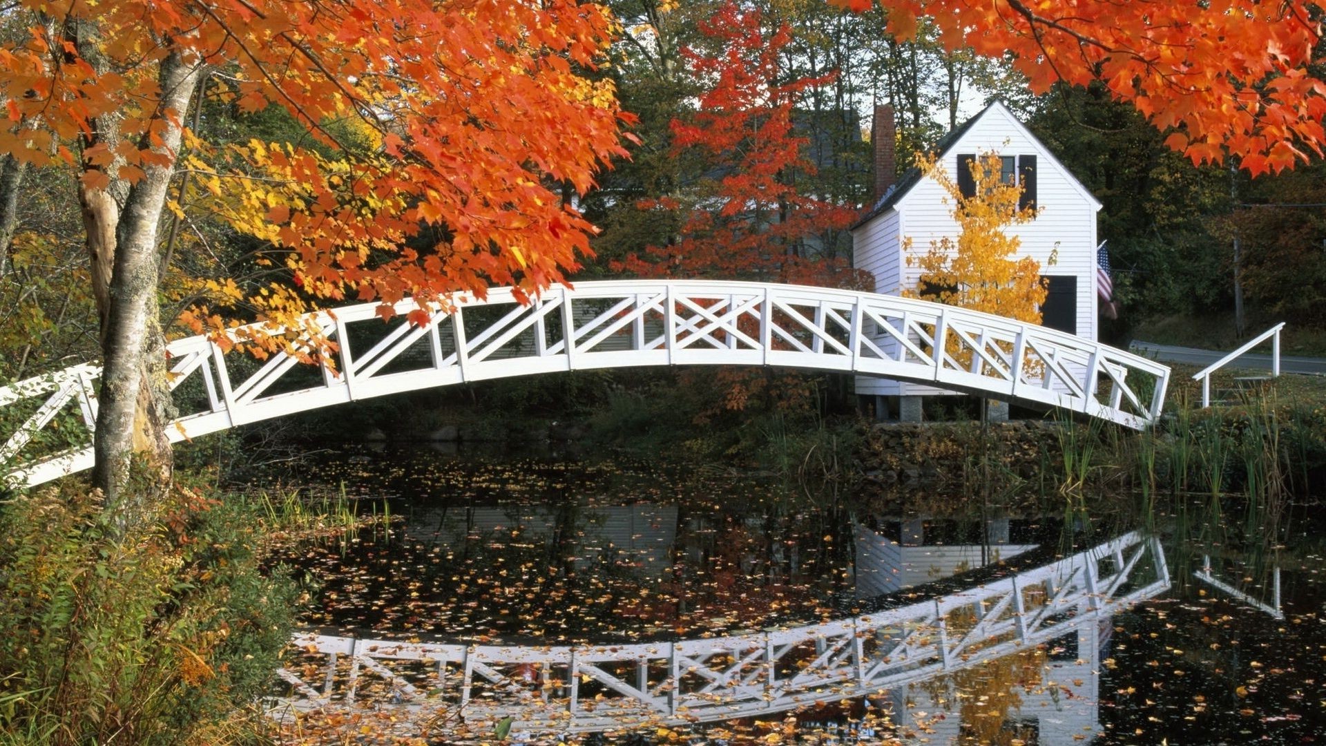 Haus mit Brücke über den Teich im Herbst