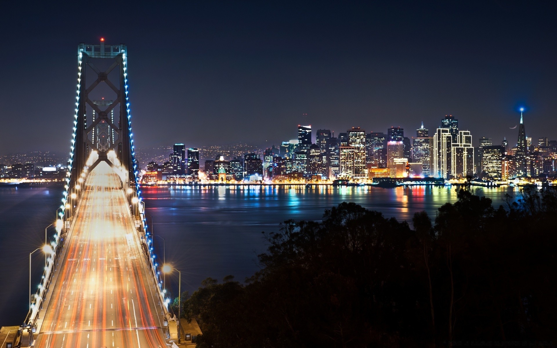 Sonnenuntergang am Himmel hinter der Brücke vor dem Hintergrund des Wassers in einer anderen Stadt