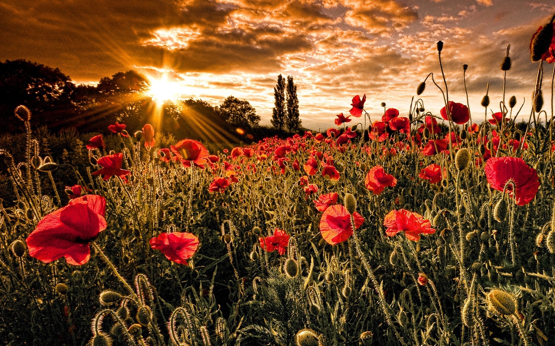 Mohnwiese in der Sonne bei Sonnenuntergang