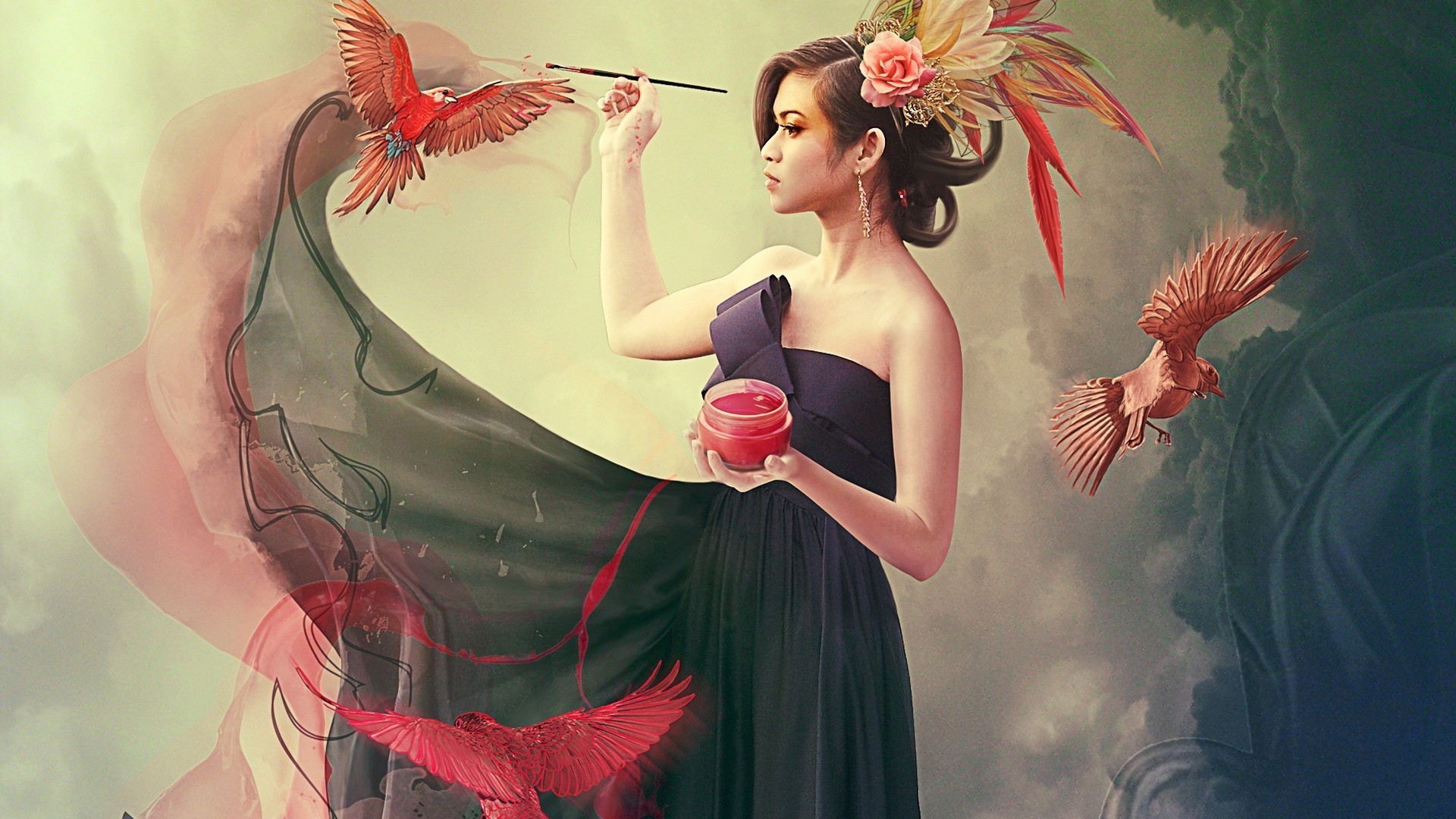 Fantastische anime-mädchen-hexe mit hörnern schaut in den spiegelFantastische Anime-Mädchen-Hexe mit Hörnern schaut in den Spiegel