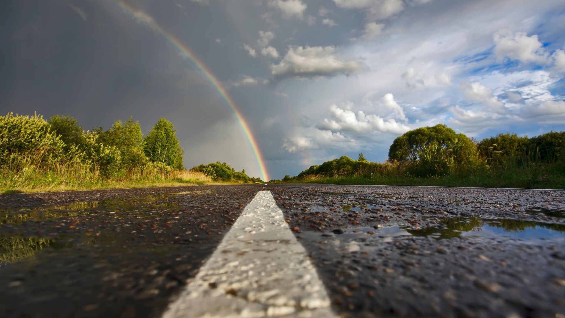 Die Straße, die in einen Regenbogen und einen bewölkten Himmel übergeht