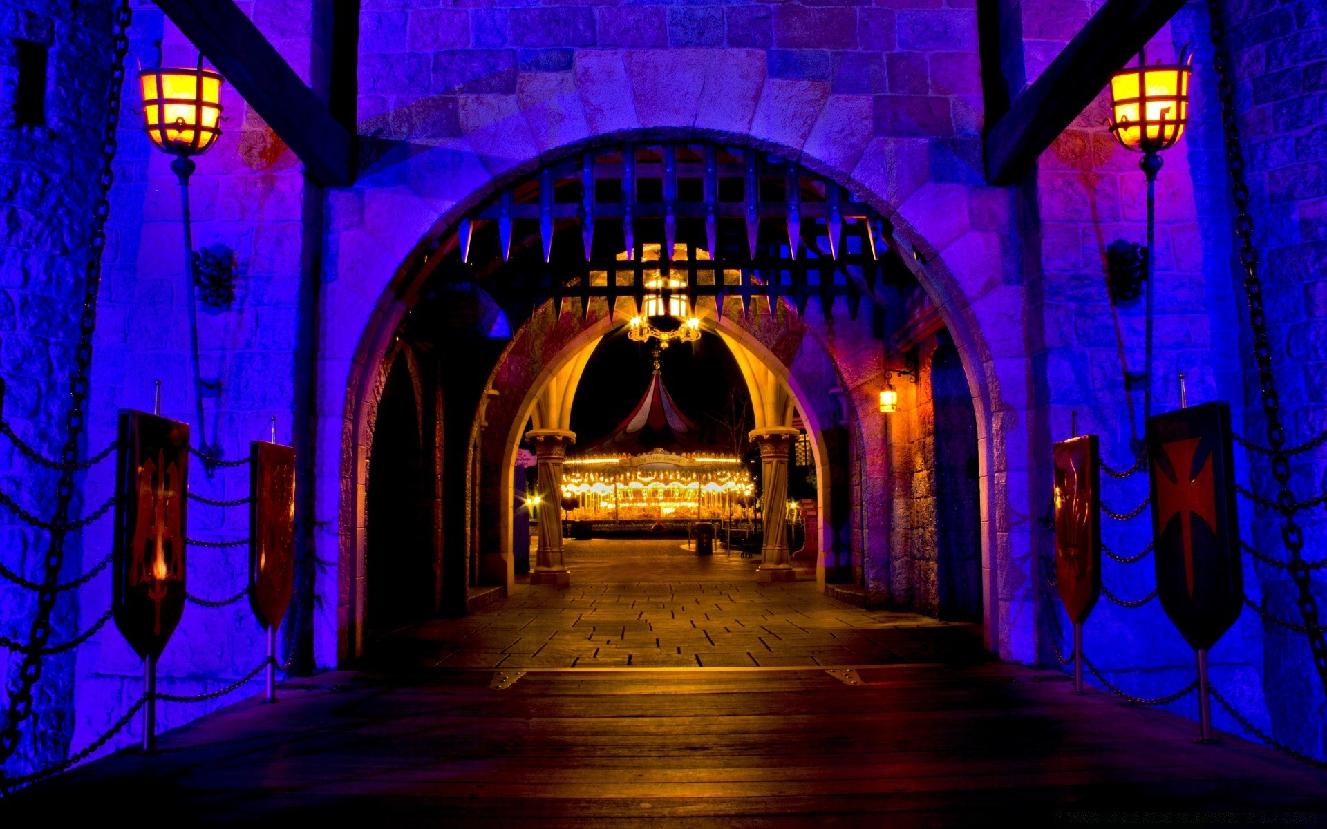 Am Abend schaltet sich die Beleuchtung der Brunnen ein