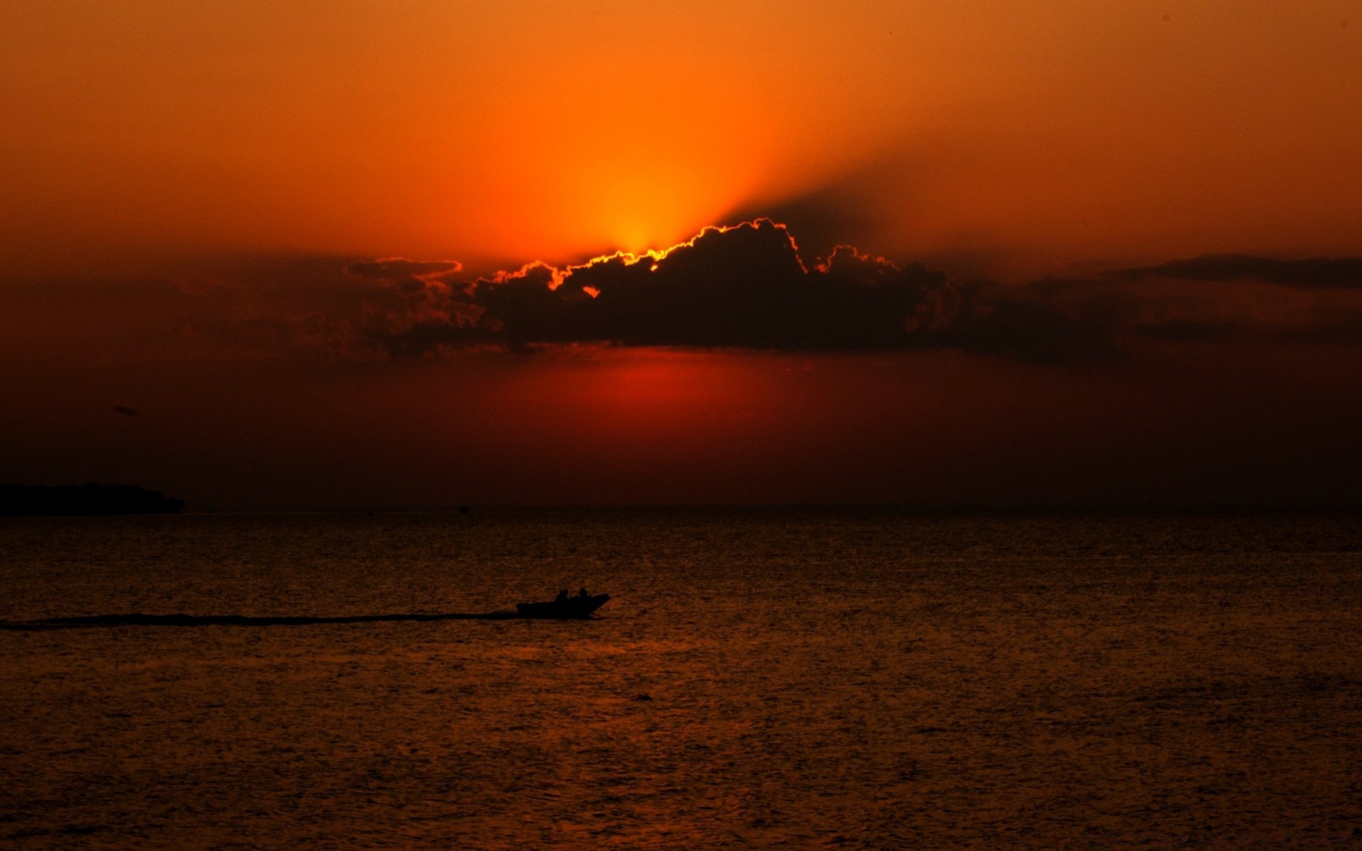 Ein Boot rast bei Sonnenuntergang über das Meer