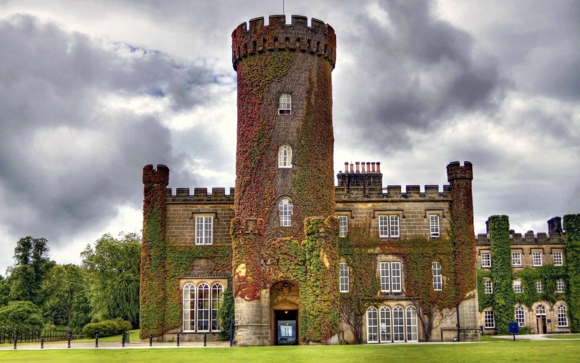 Gotisches Schloss auf Himmelshintergrund und Blumenbeeten