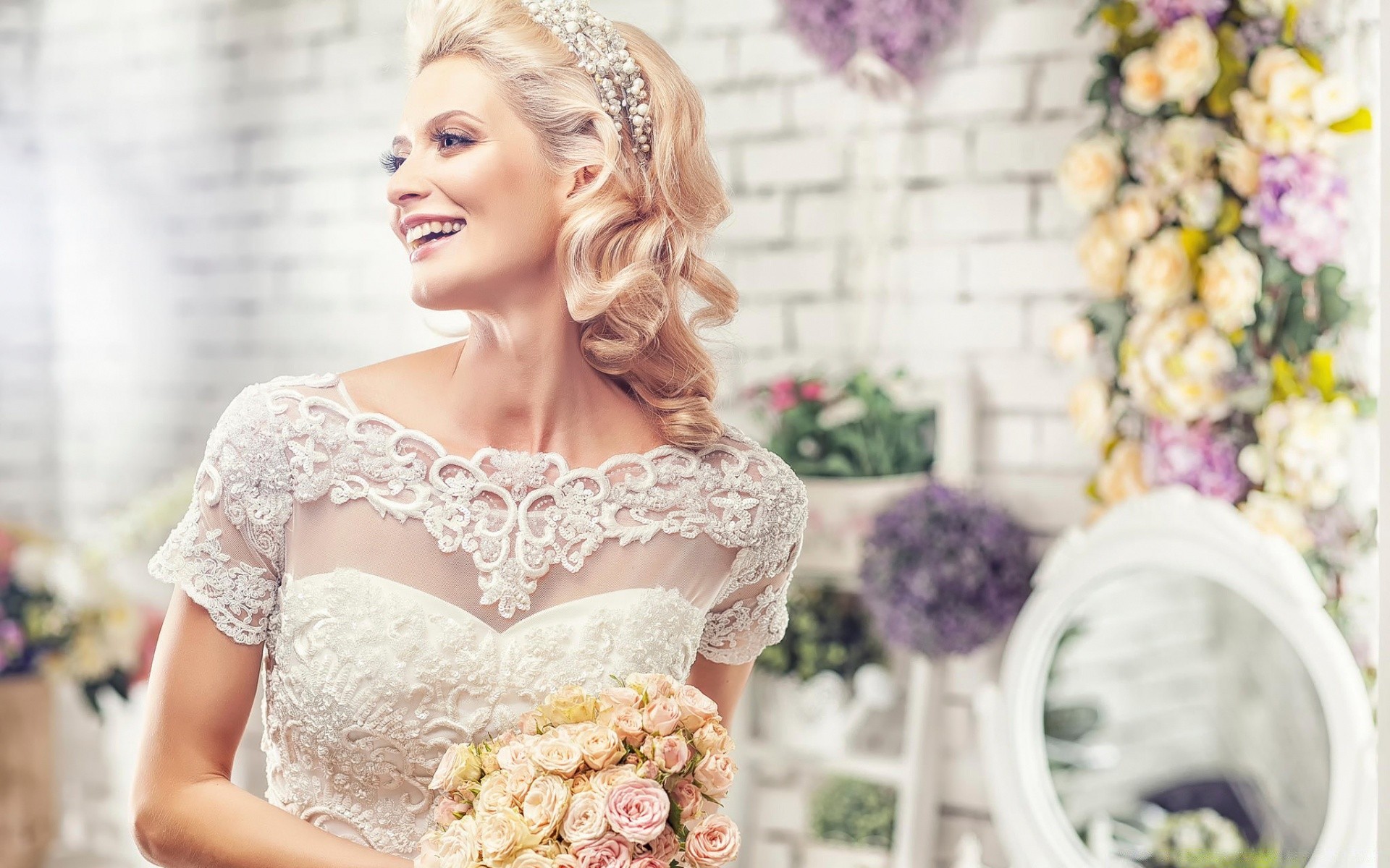 Eine zarte Braut mit einem Blumenstrauß in ihren Händen