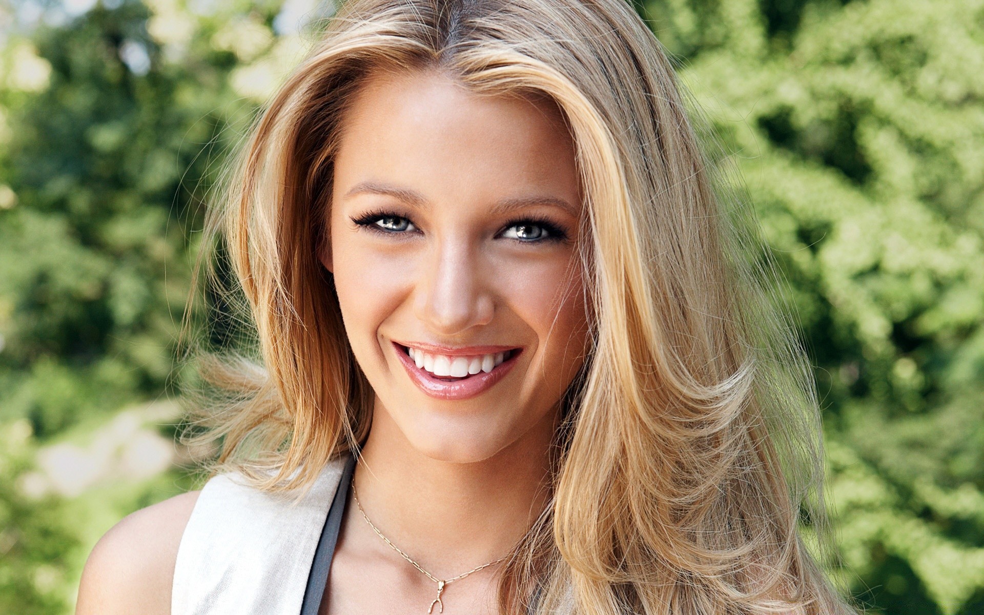 Schauspielerin mit blauen Augen und blonden Haaren im Pullover mit weitem Hals