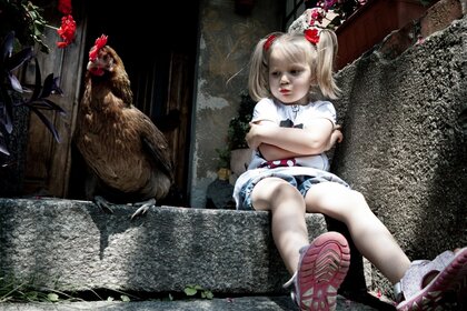 Zwei eier betrachten die leiche eines von menschen getöteten kollegen und werden gebratenZwei Eier betrachten die Leiche eines von Menschen getöteten Kollegen und werden gebraten