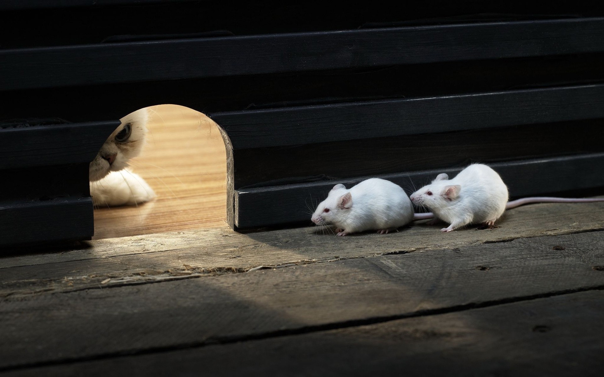 Eine Katze im roten Kopftuch sitzt auf einem Stuhl