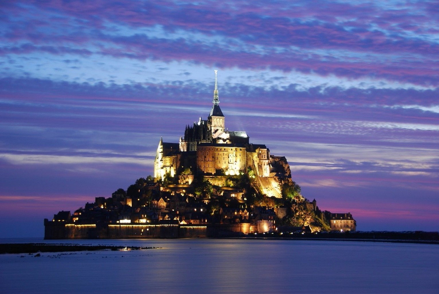 BURG IM MORGENGRAUEN INMITTEN DER WASSEROBERFLÄCHE