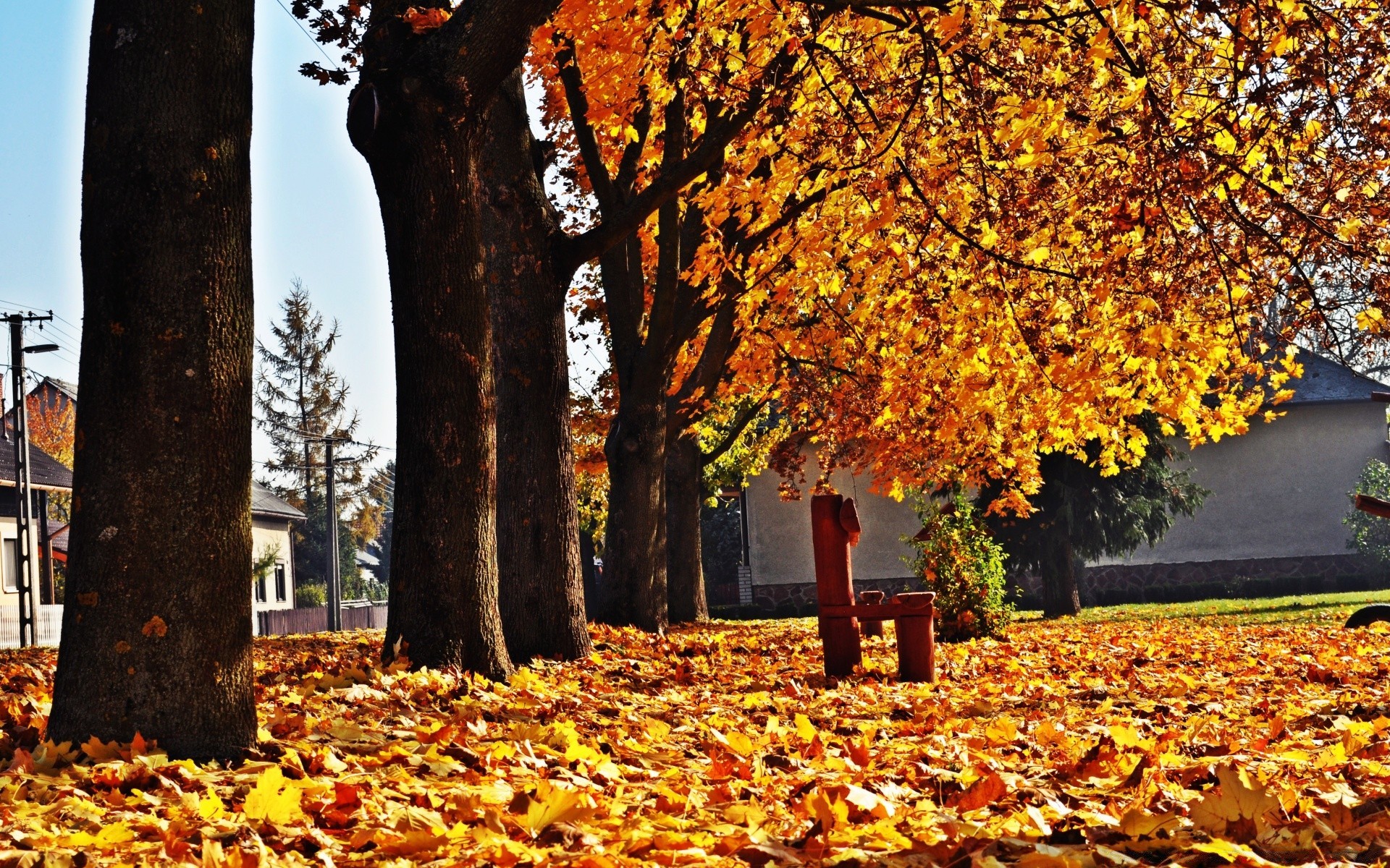 Die Ahornbäume stehen direkt in einer Reihe. Herbst