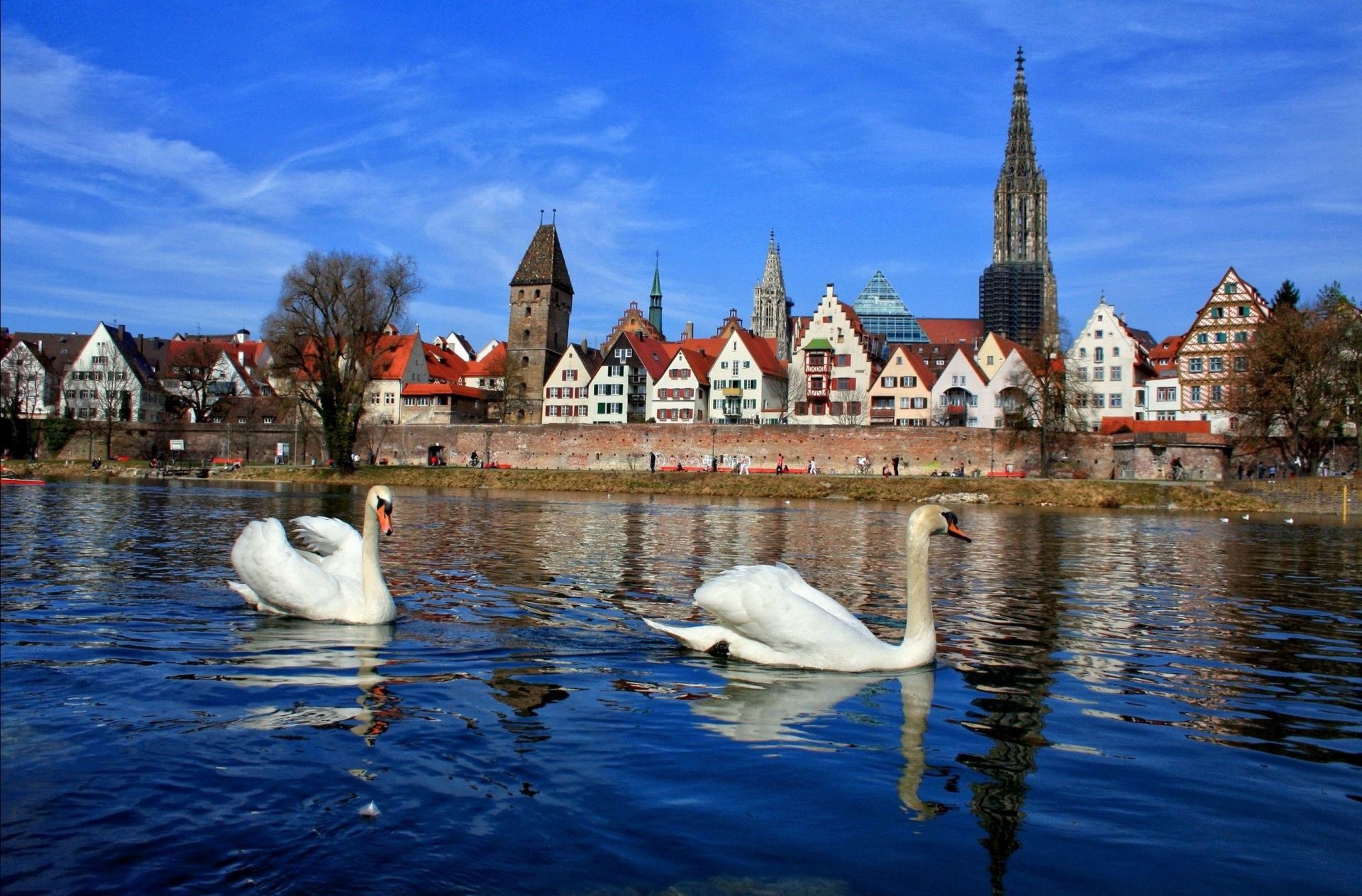 Zwei Schwäne im Hintergrund der Stadt