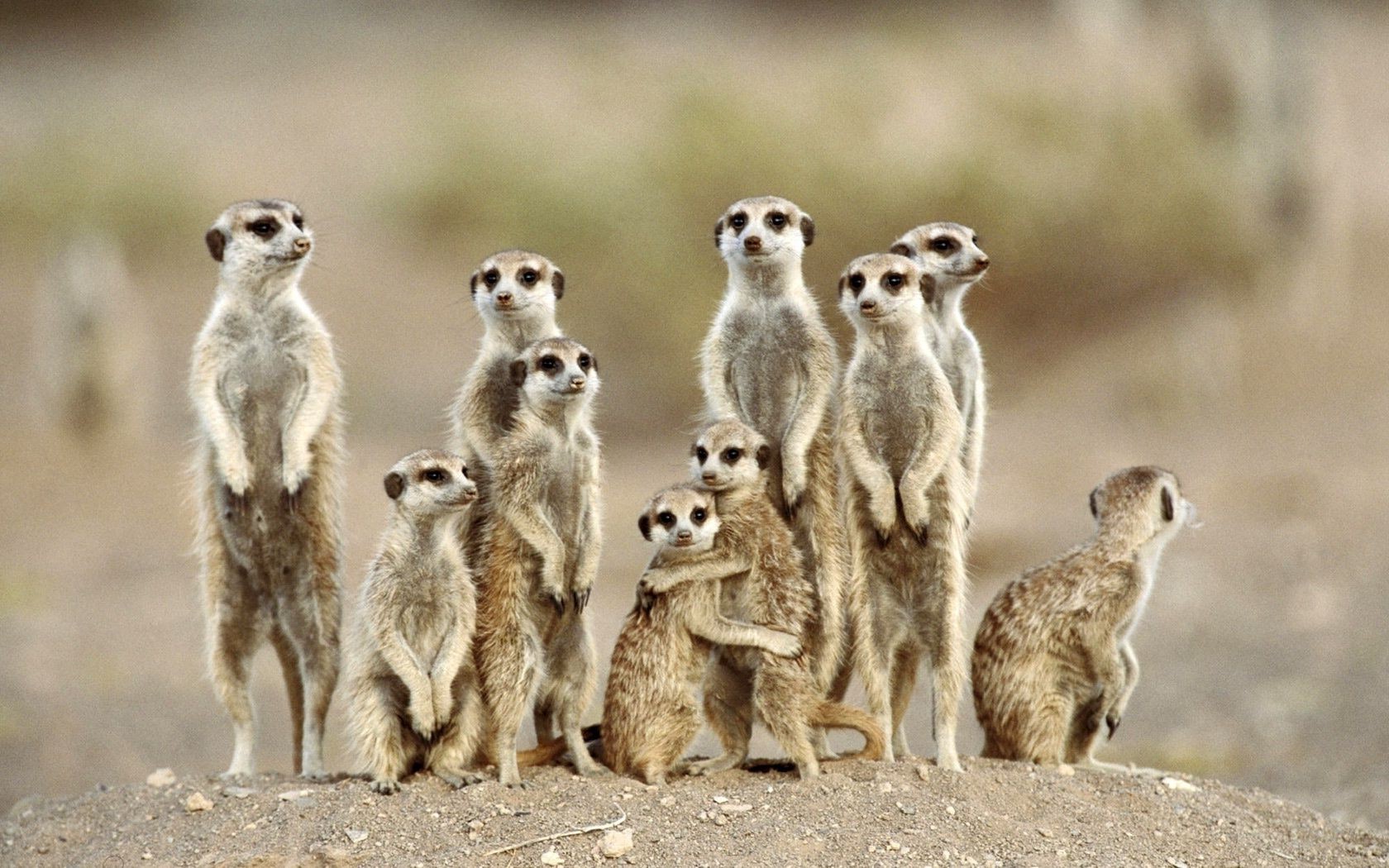 Eine Schar Erdmännchen in der Wüste schaut in die Ferne