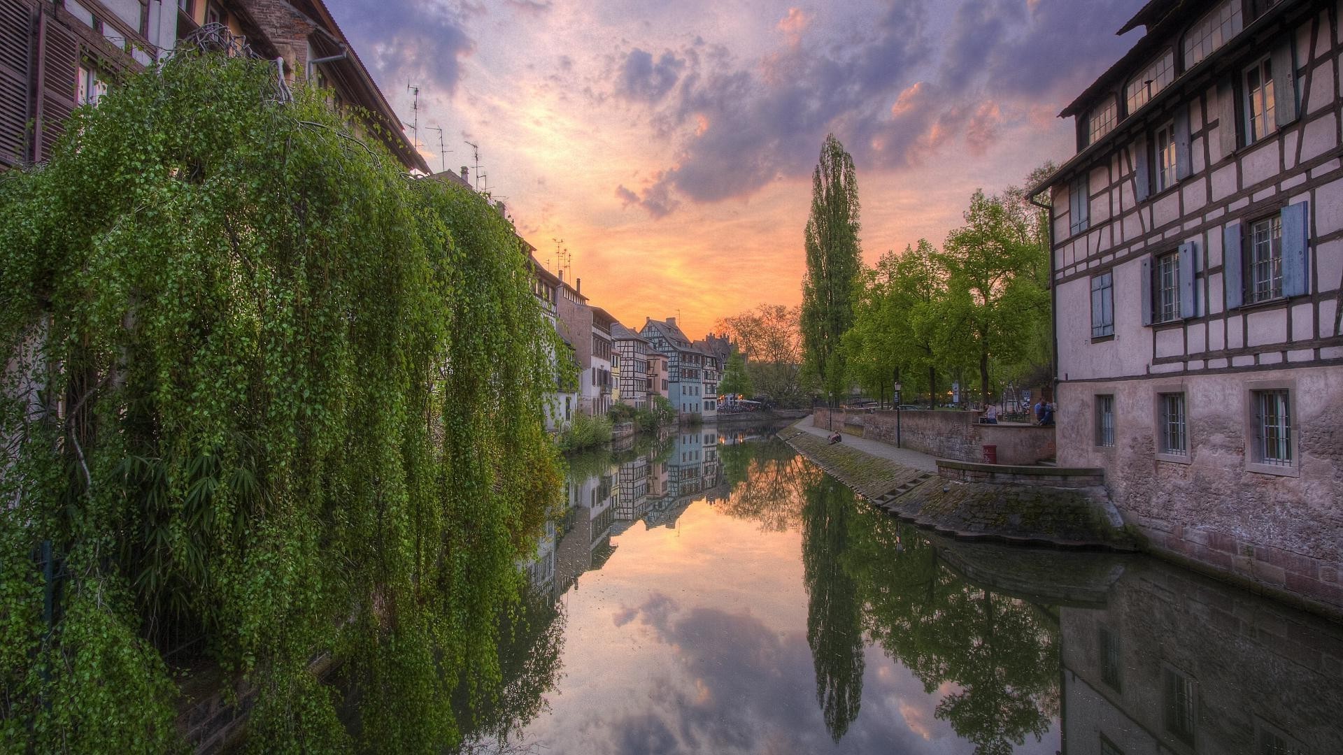 Kanal in der Stadt zwischen Häusern bei Sonnenuntergang