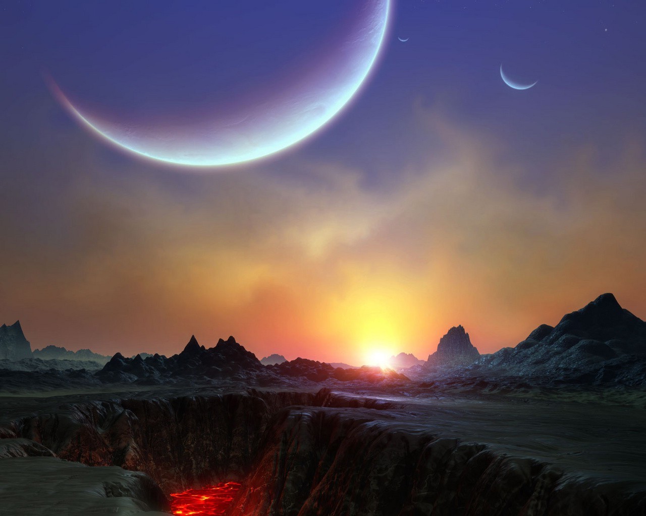 In einer steinspalte heiße lava vor dem hintergrund des sonnenuntergangsIn einer Steinspalte heiße Lava vor dem Hintergrund des Sonnenuntergangs