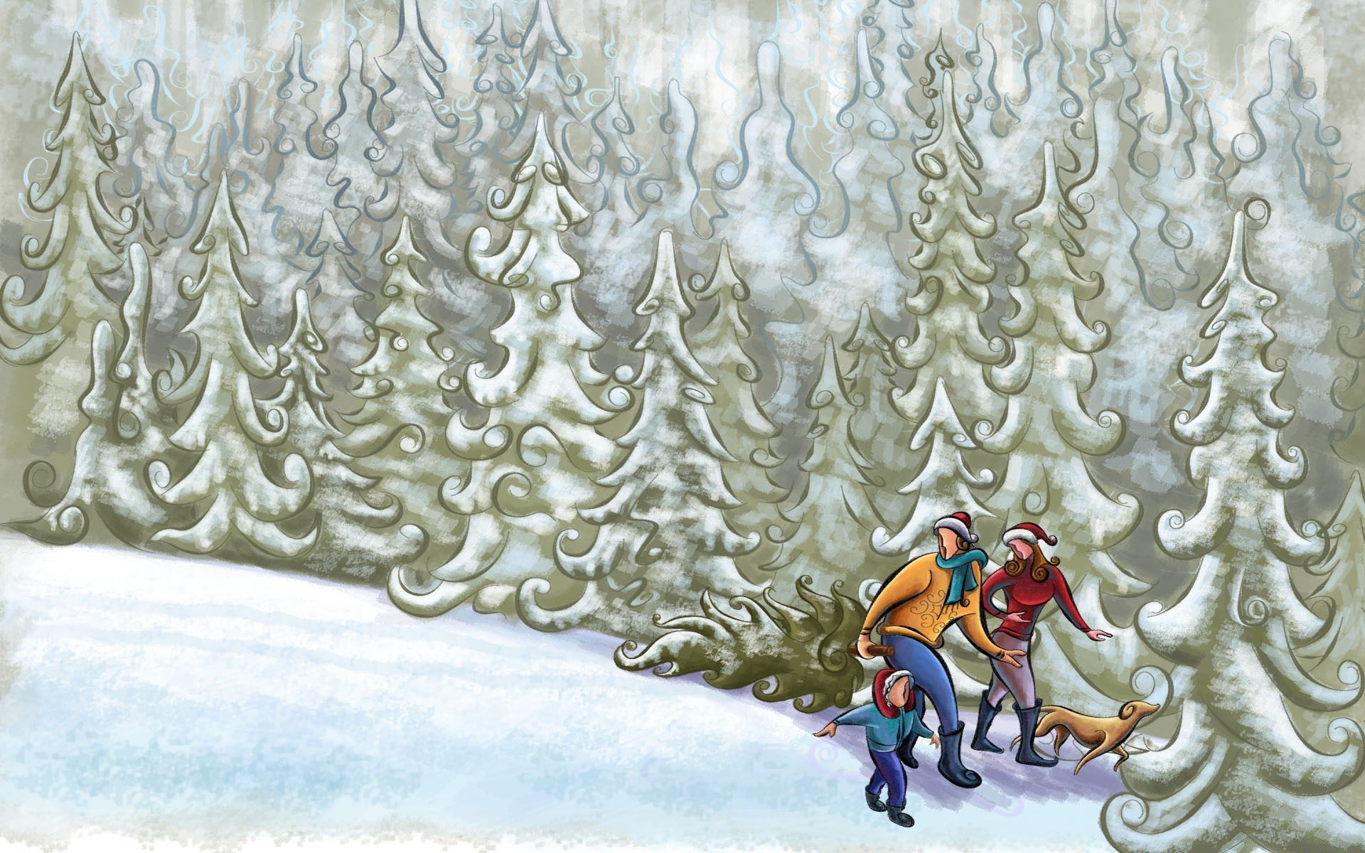Zeichnung einer Familie mit einem Hund im Winterwald