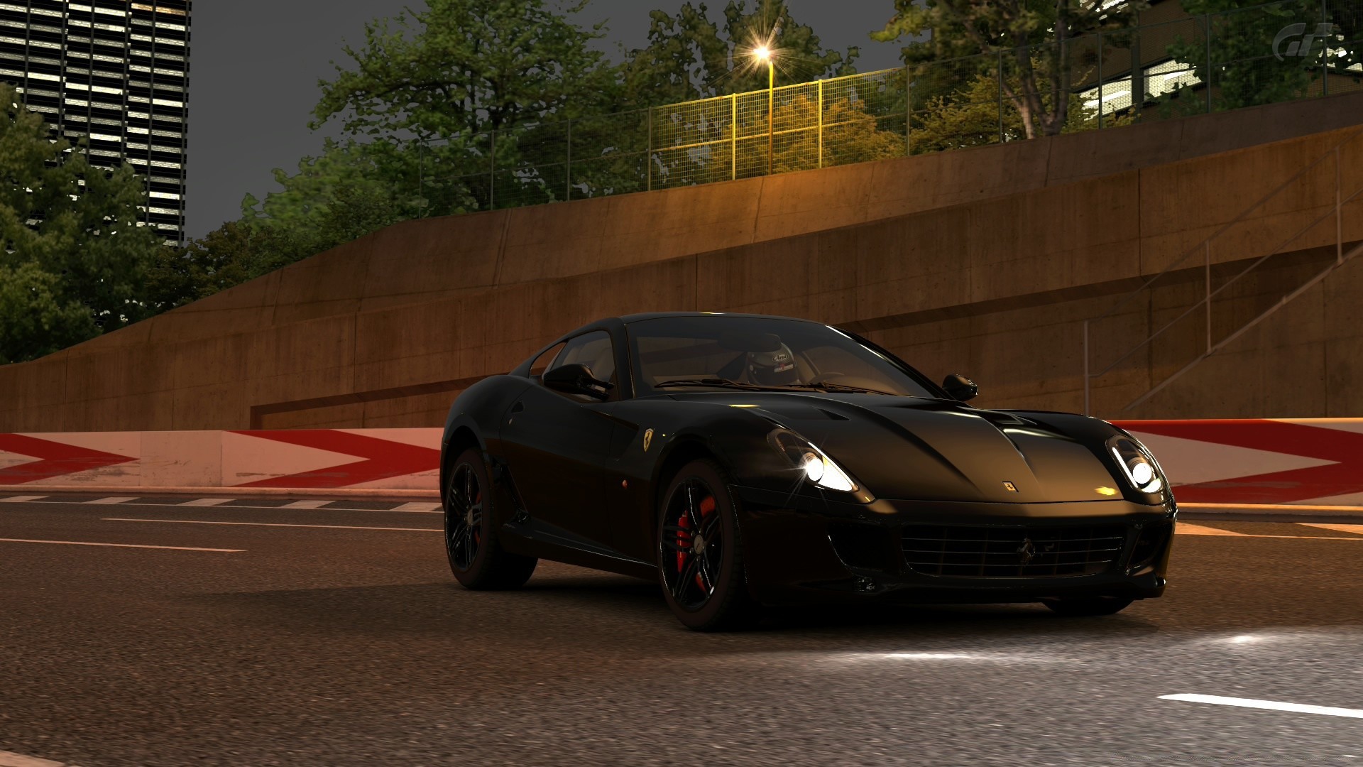 Ein graues auto in einer abendstraße, die von laternen beleuchtet wirdEin graues Auto in einer Abendstraße, die von Laternen beleuchtet wird