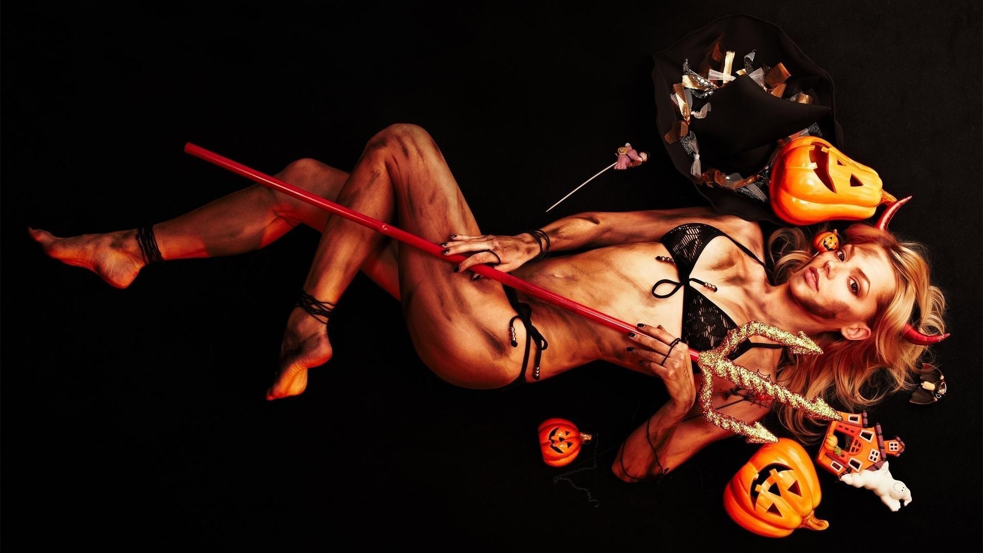 Mädchen im schwarzen Bikini mit einem Dreizack in den Händen