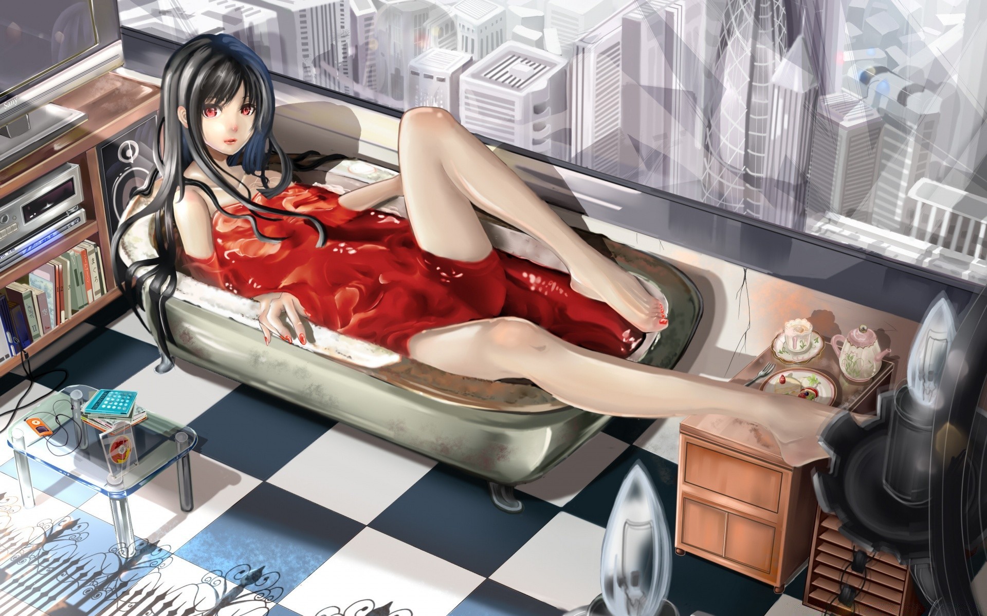 Anime-Mädchen liegt mit Blut im Badezimmer