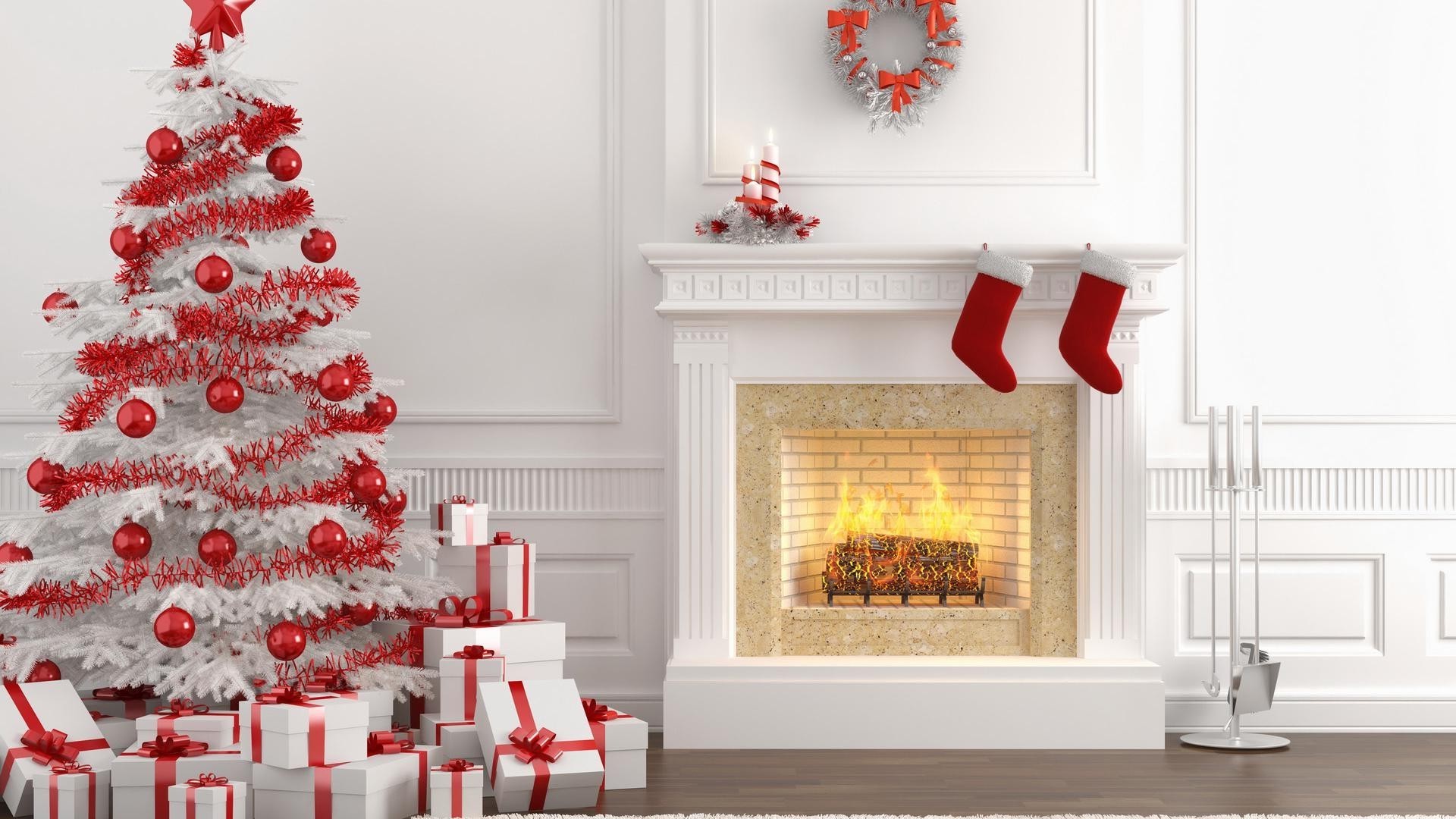 Ein Weihnachtsbaum am Kamin im rot-weißen Stil und ein Berg von Geschenken