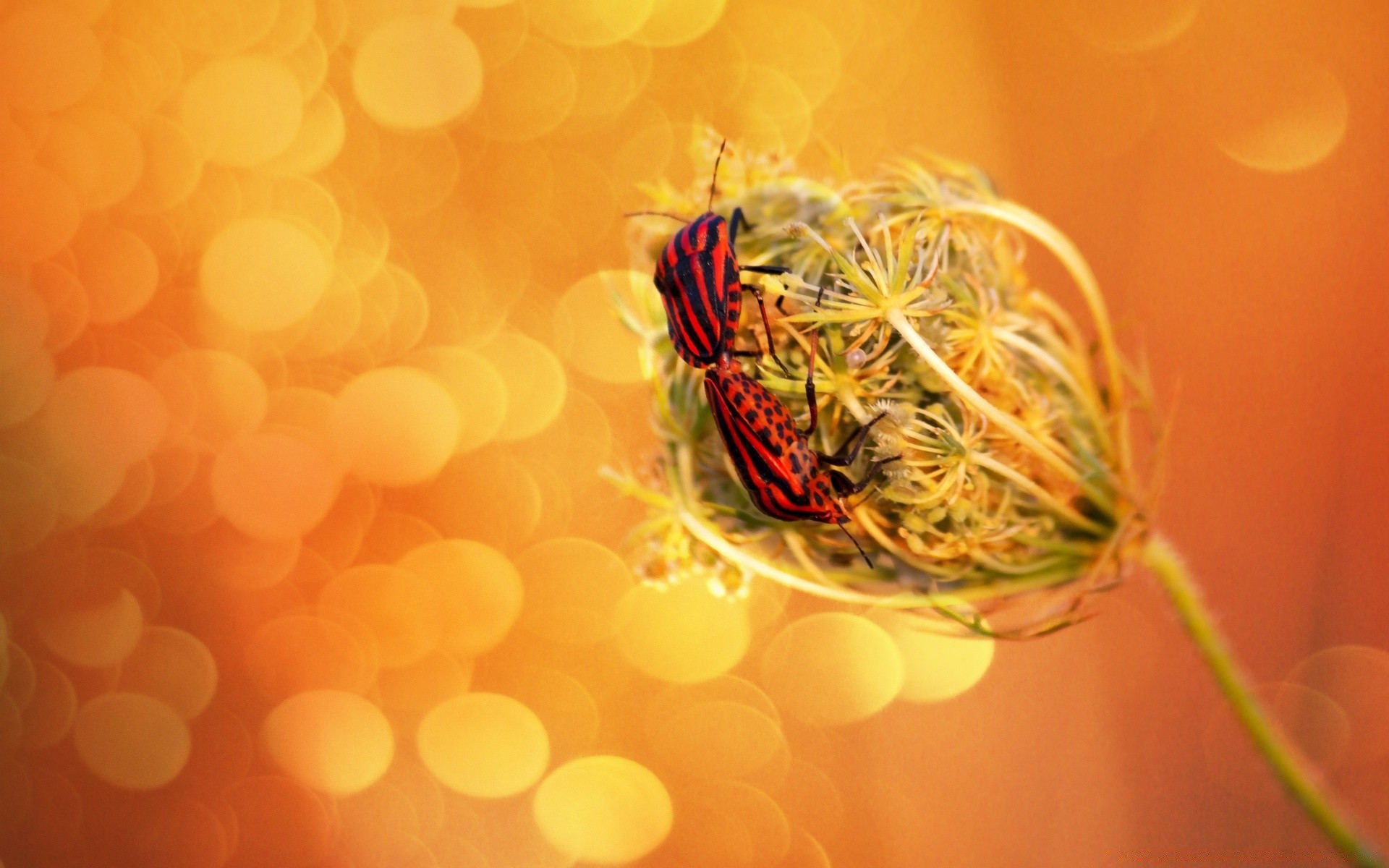 Rotes Insekt auf Löwenzahn auf orangefarbenem Hintergrund