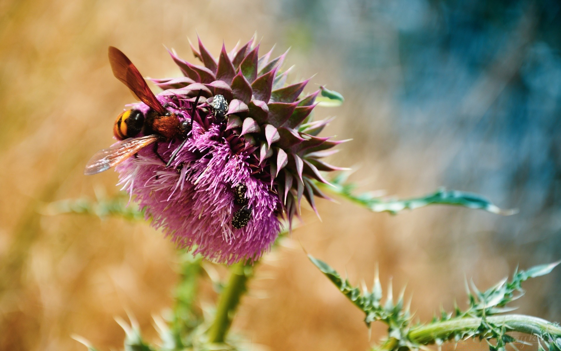 Eine Biene sitzt auf einer Klettenblüte