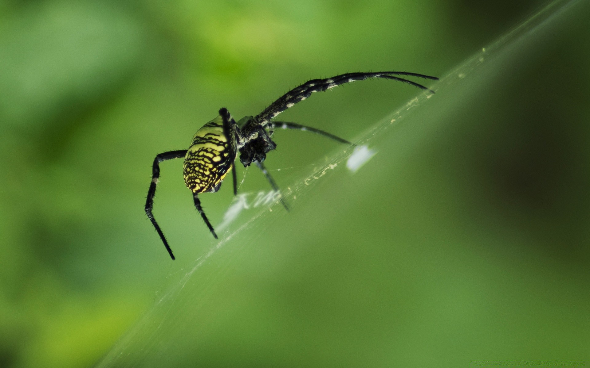 Eine gelb-schwarze spinne, die auf einem spinnennetz auf einem grünen hintergrund stehtEine gelb-schwarze Spinne, die auf einem Spinnennetz auf einem grünen Hintergrund steht