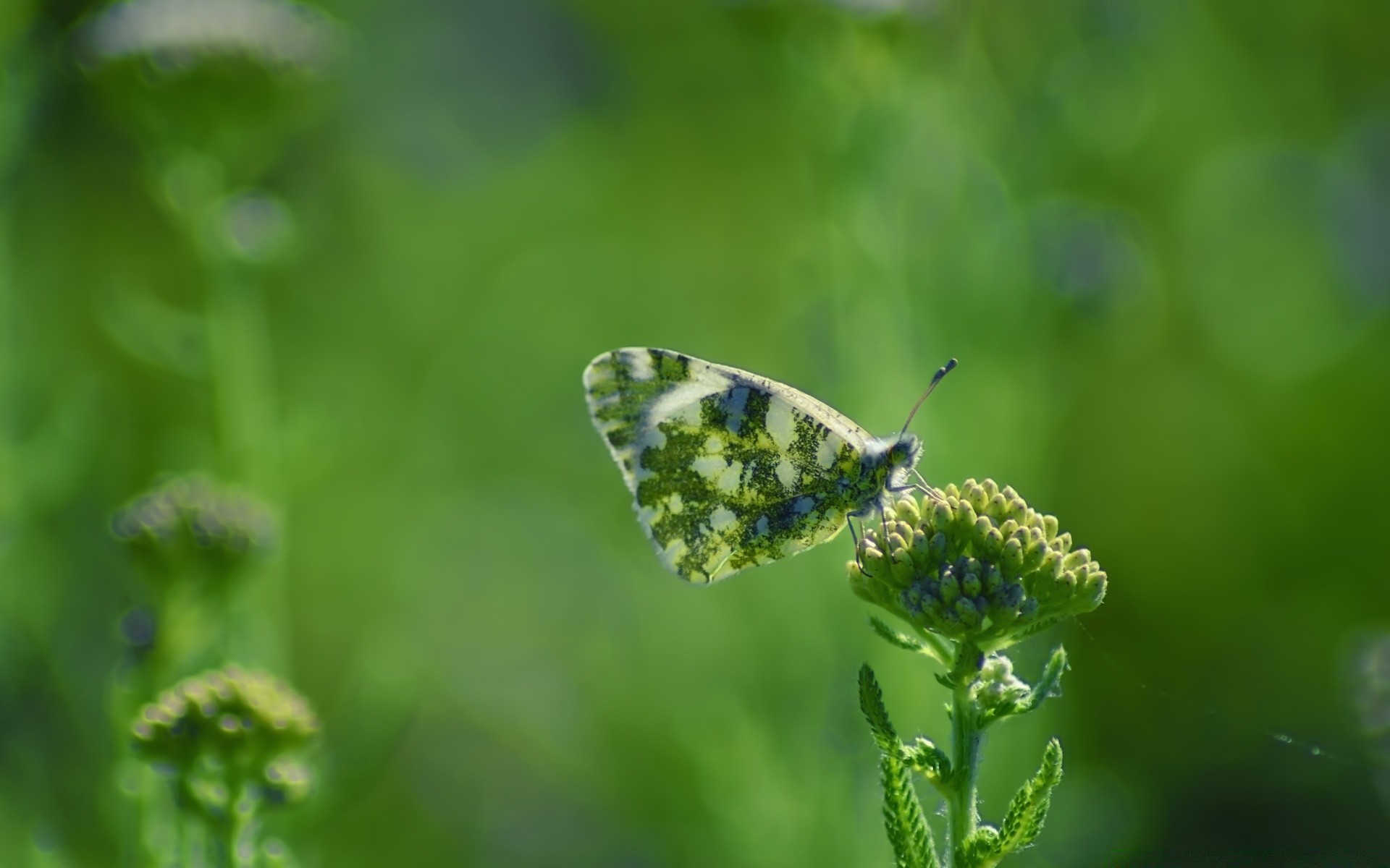 Schmetterling sitzt auf blütenstand auf grünem hintergrundSchmetterling sitzt auf Blütenstand auf grünem Hintergrund