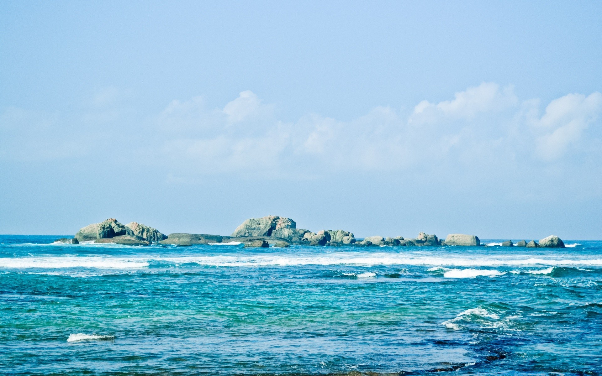 Küste mit Häusern vor dem Hintergrund des Meeres und der grünen Hügel