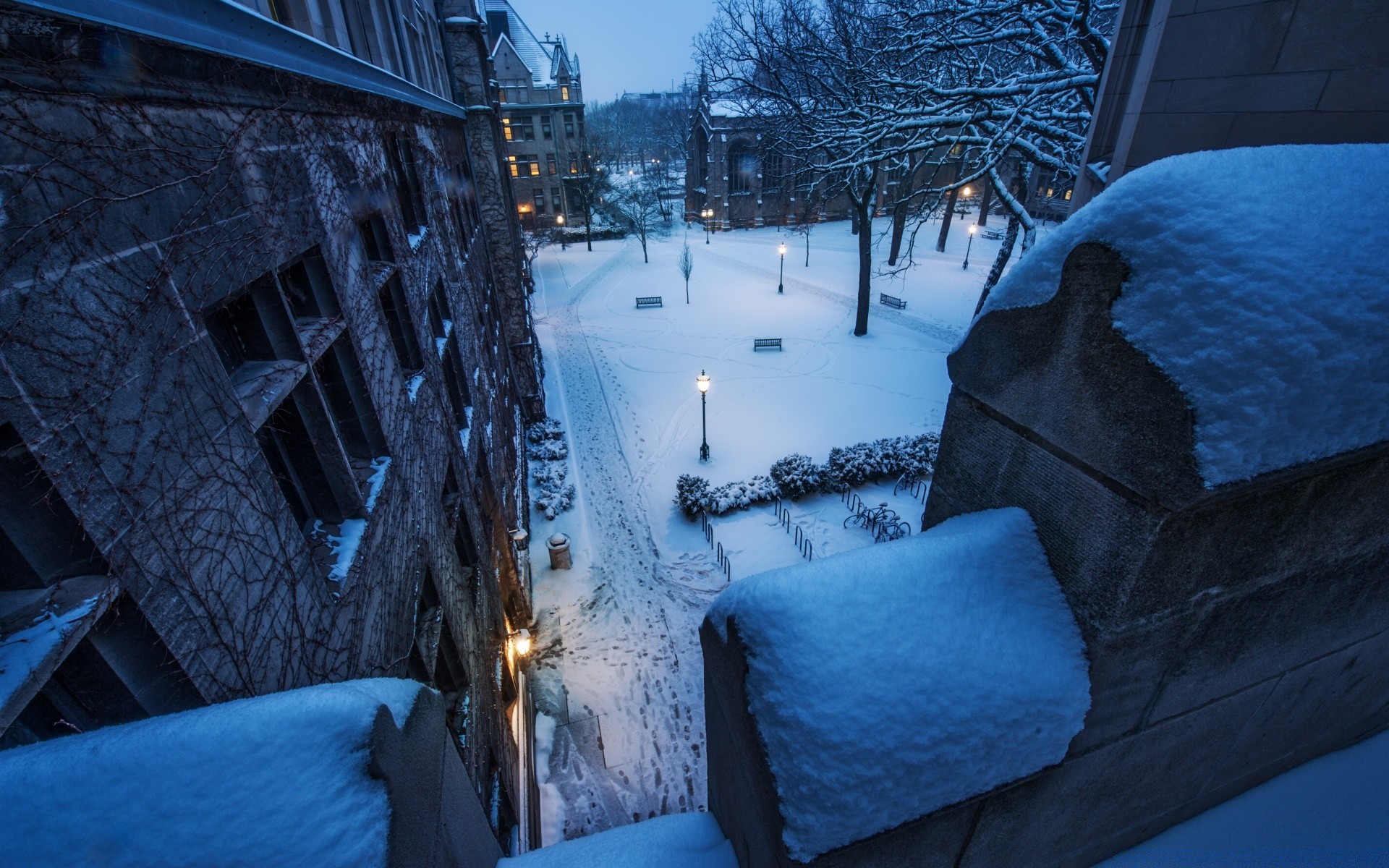 Ein verschneiter Hof mit Laternen, eine Winternacht in Amerika