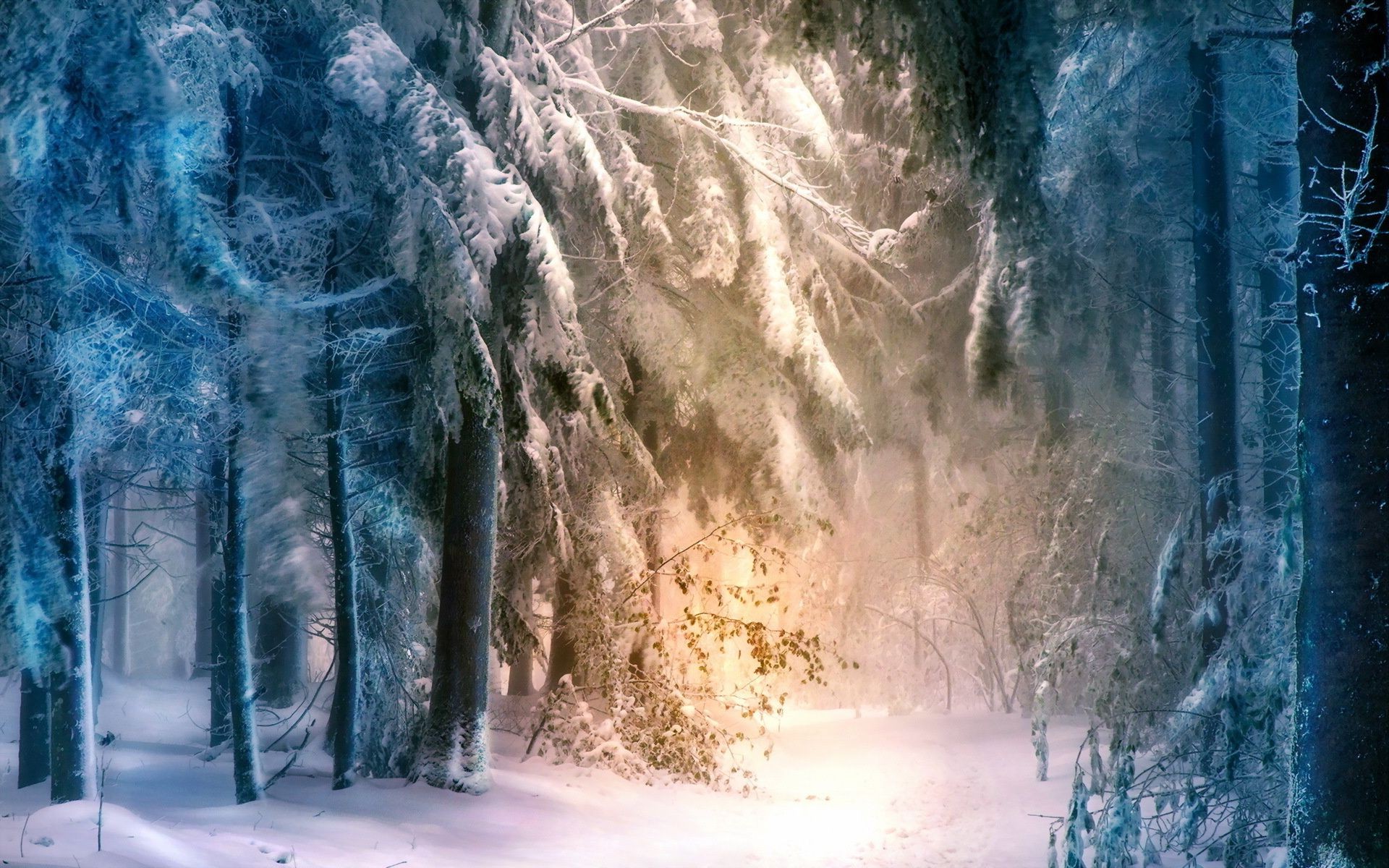 Bäume, die im kalten Wald mit Schnee bedeckt sind