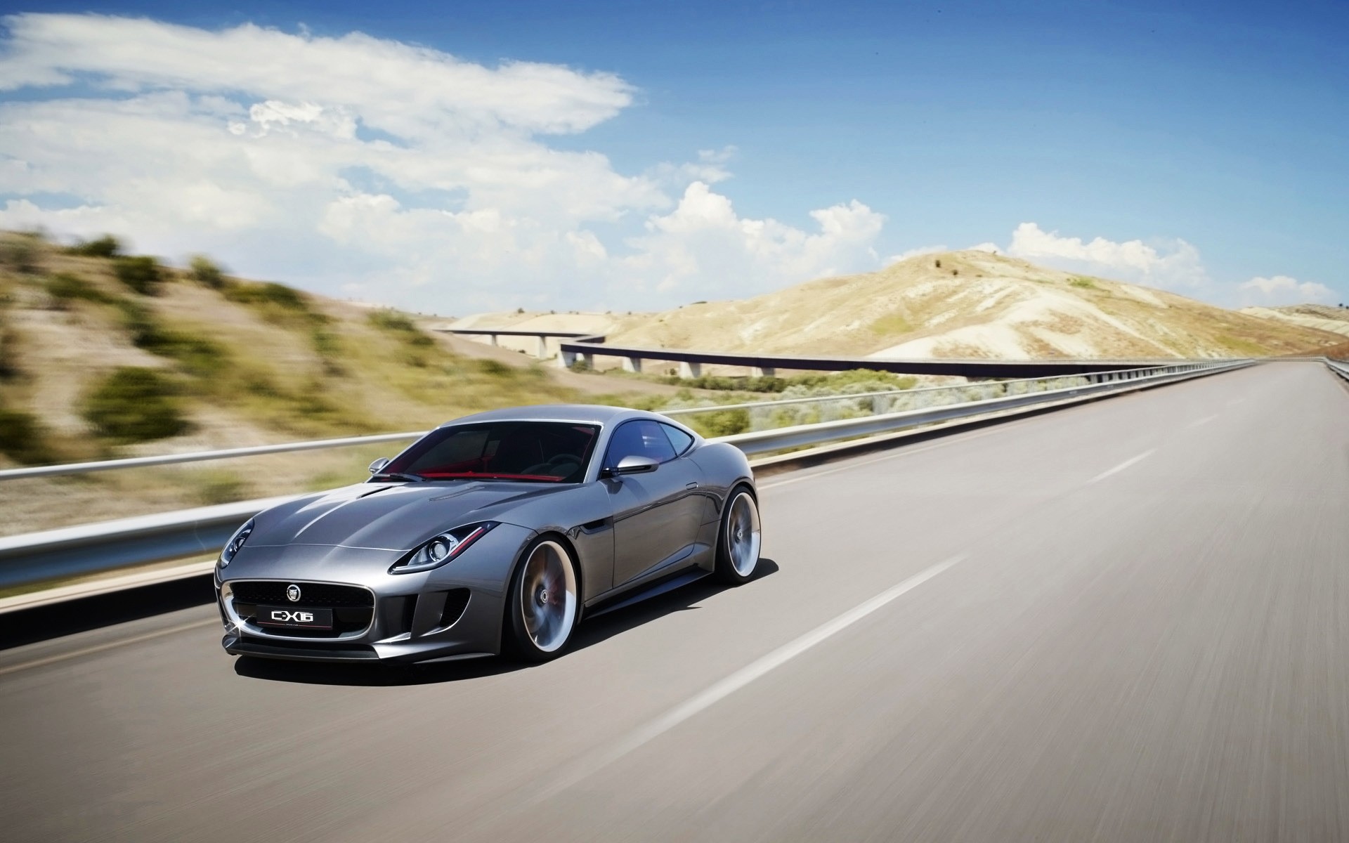 Das Auto fährt auf der Autobahn vor dem Hintergrund der Hügel und des Himmels in den Wolken