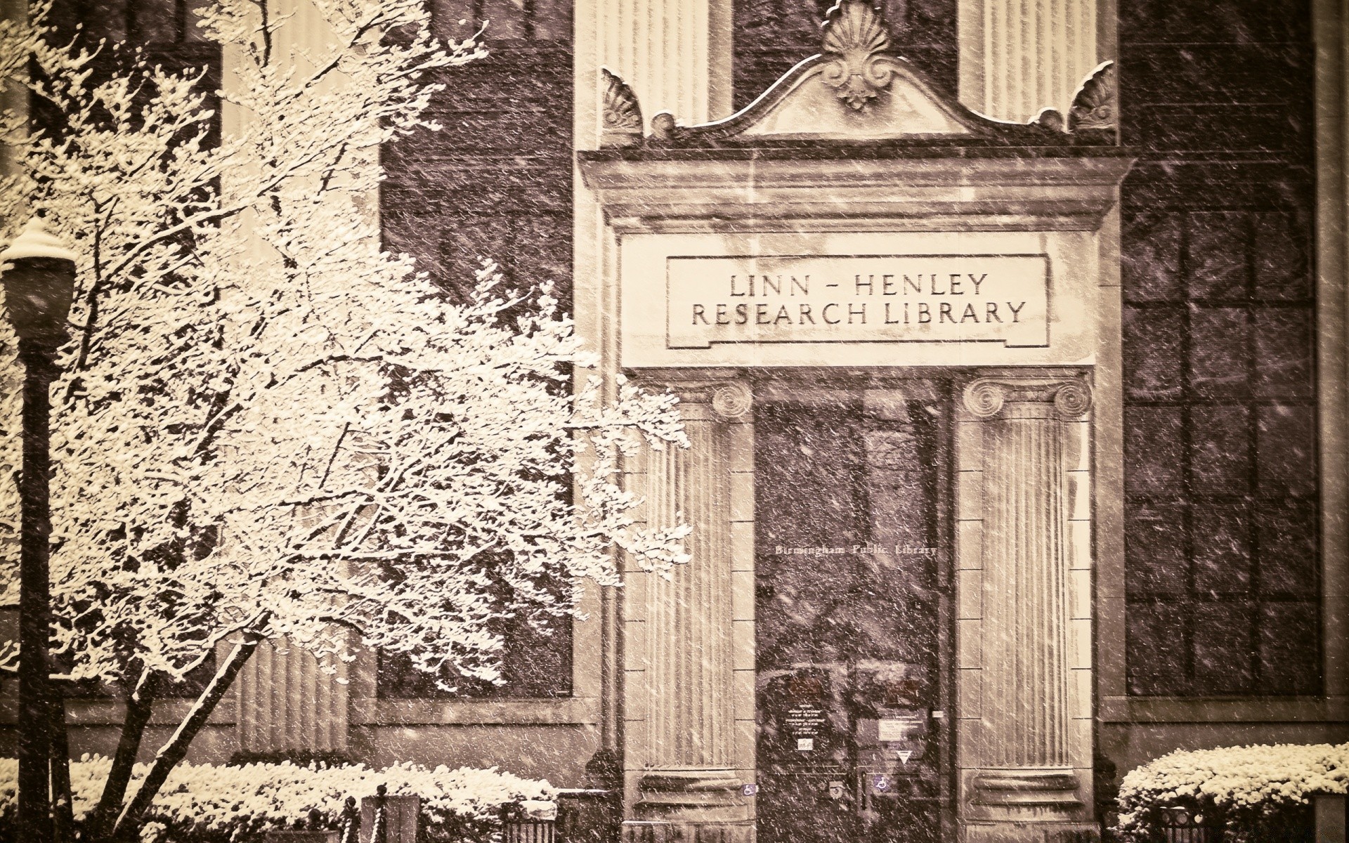 Altes bibliotheksfoto mit blühendem baum und laterneAltes Bibliotheksfoto mit blühendem Baum und Laterne