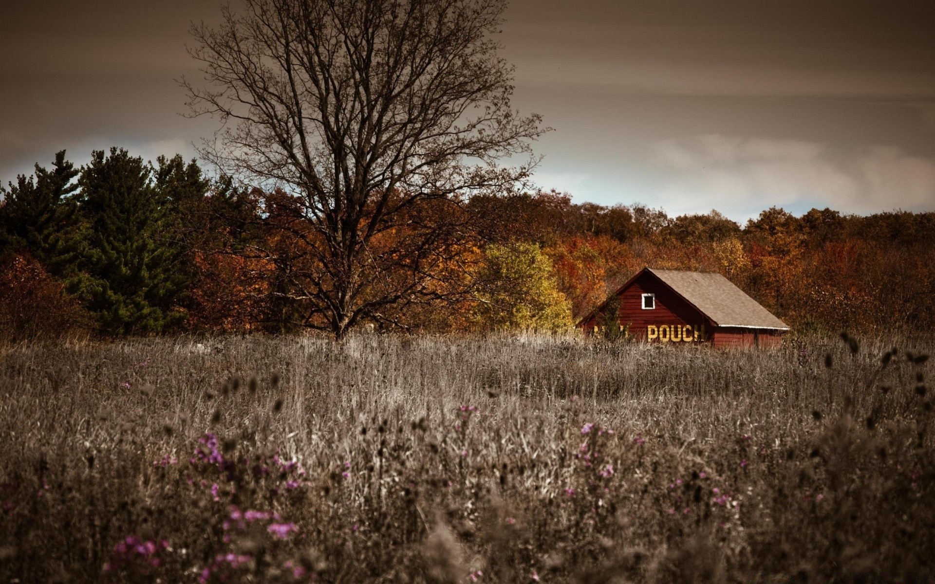 Einsames haus auf dem hintergrund des herbstwaldesEinsames Haus auf dem Hintergrund des Herbstwaldes