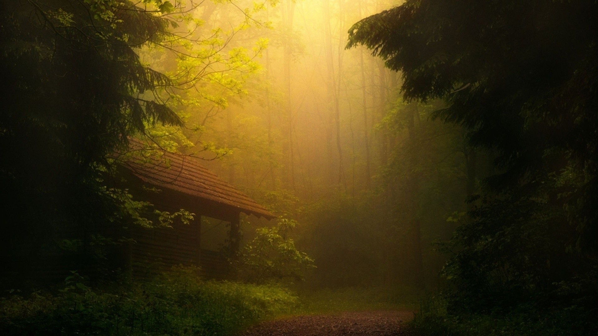 Holzhaus auf einem felsen inmitten eines herbstwaldesHolzhaus auf einem Felsen inmitten eines Herbstwaldes