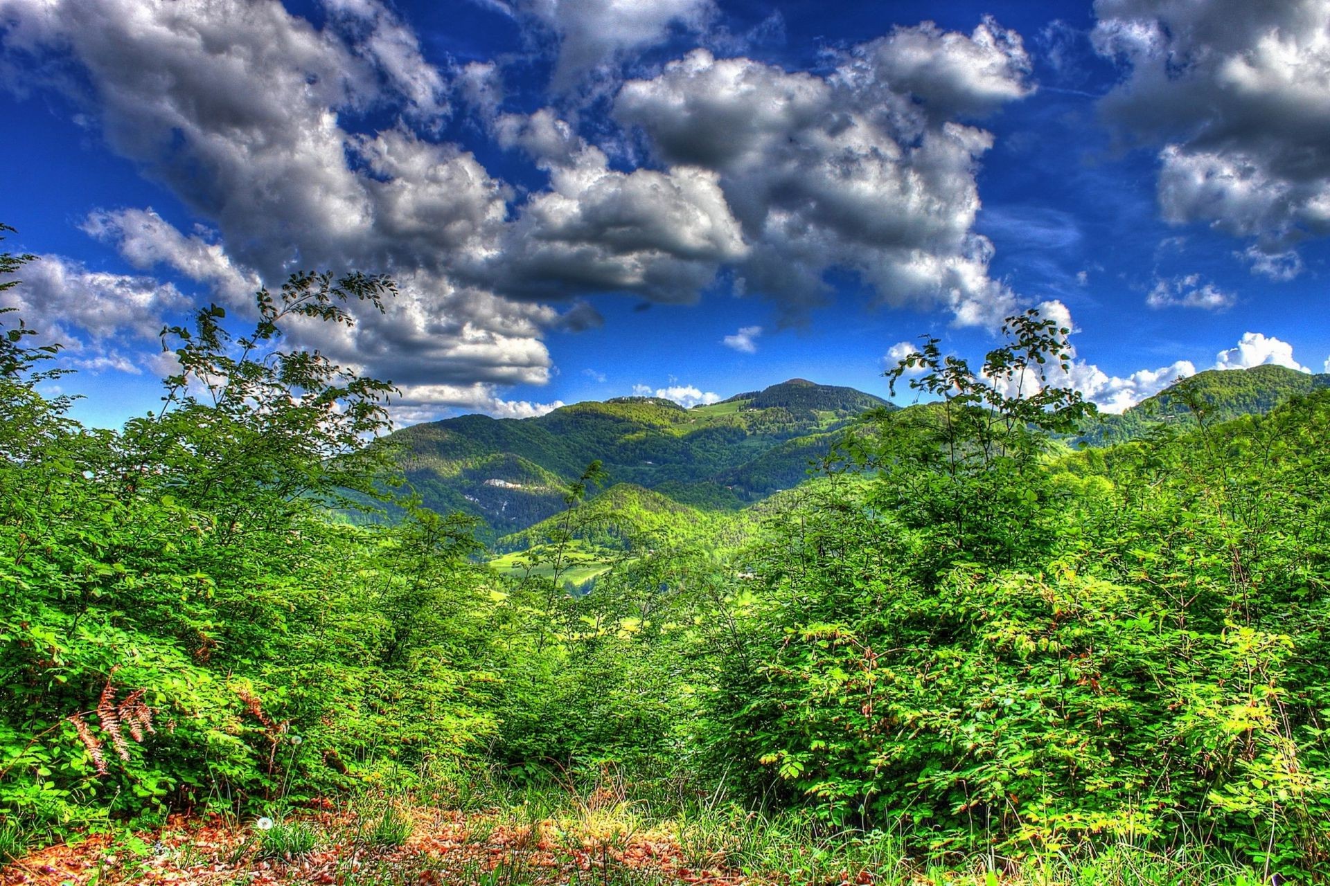 Landschaft. Grüner Wald auf dem Hintergrund der Berge
