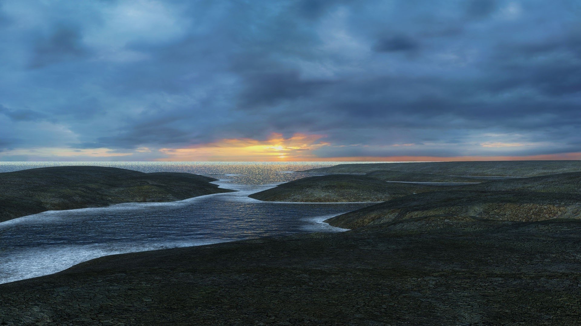 Schöne Landschaft. Sonnenuntergang am Wasser