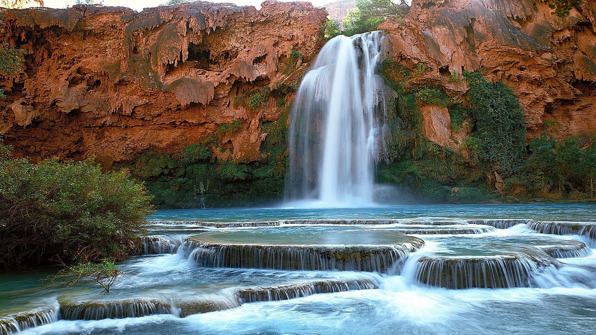Majestätische Wasserfälle, die in einen transparenten Fluss münden