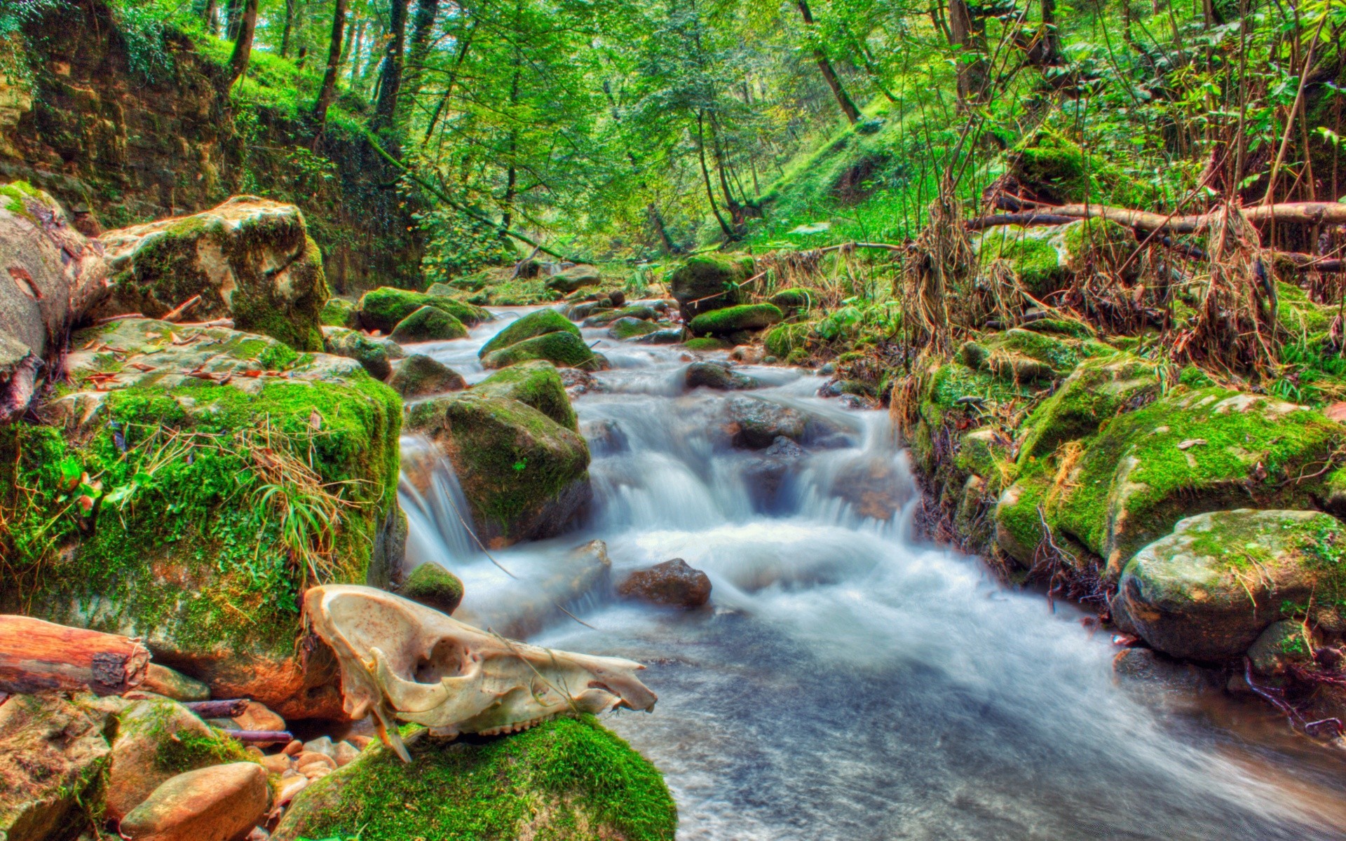 Ein Strom von Wasserfällen geht in den Fluss hinunter
