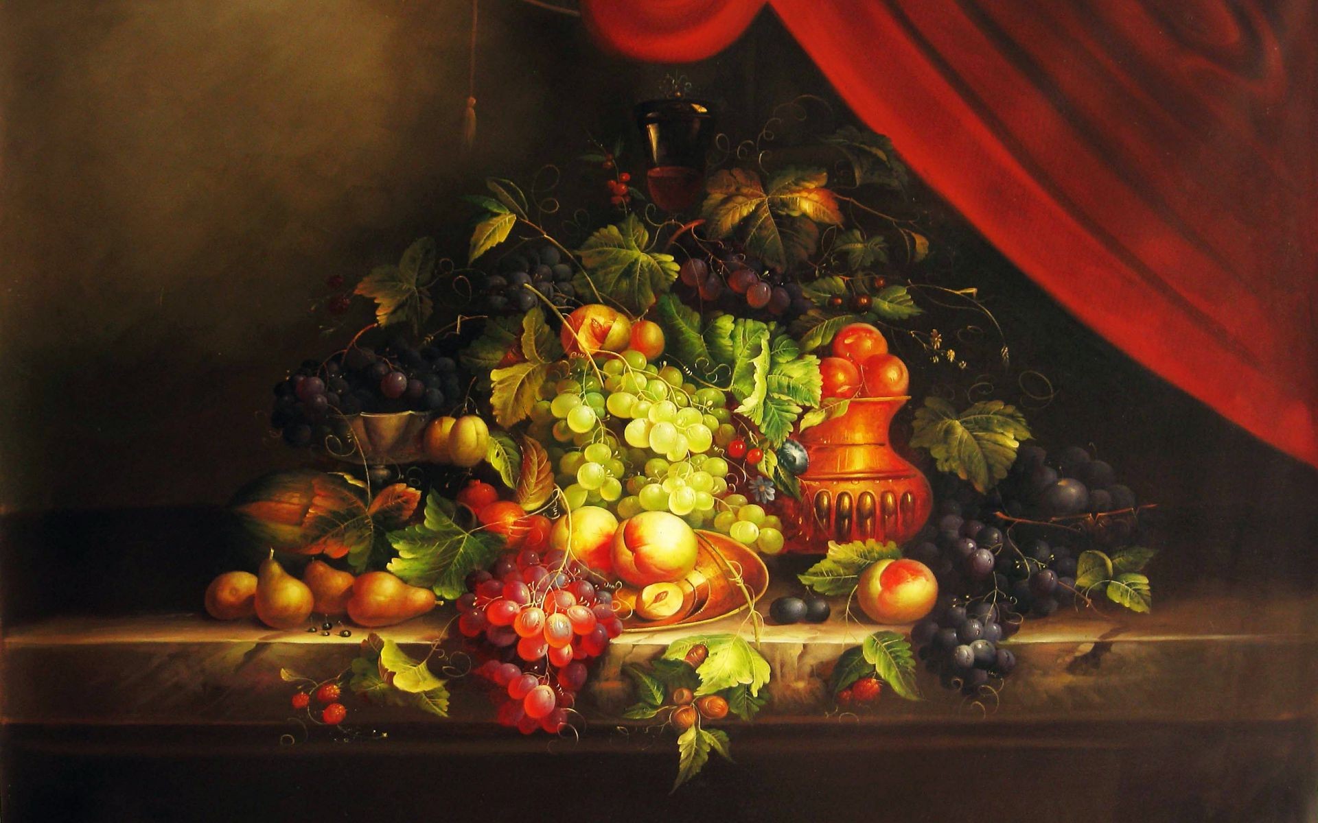 Muster von Früchten mit rotem Vorhang