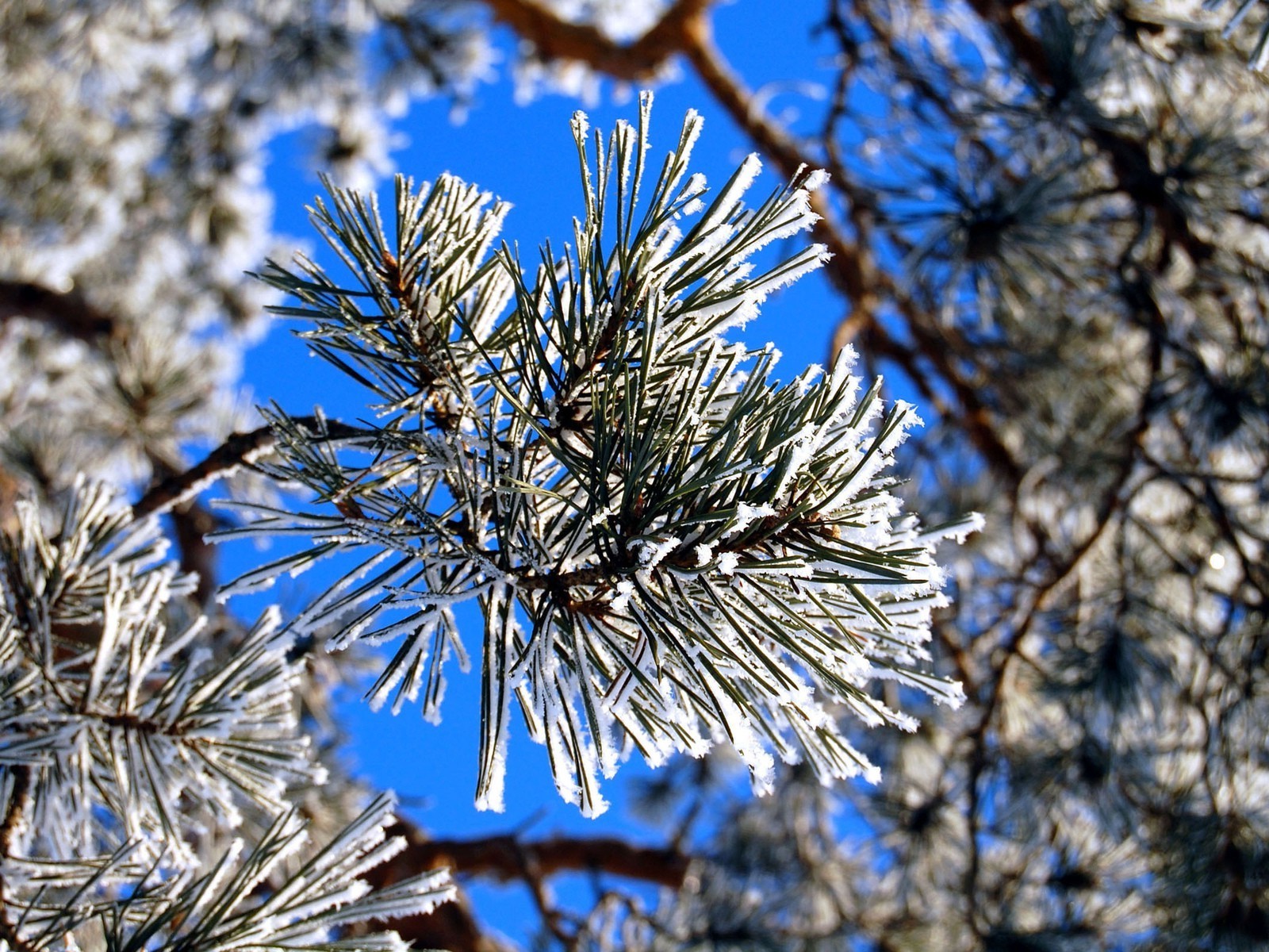 Stachelige kiefernnadeln und klarer, klarer himmel
