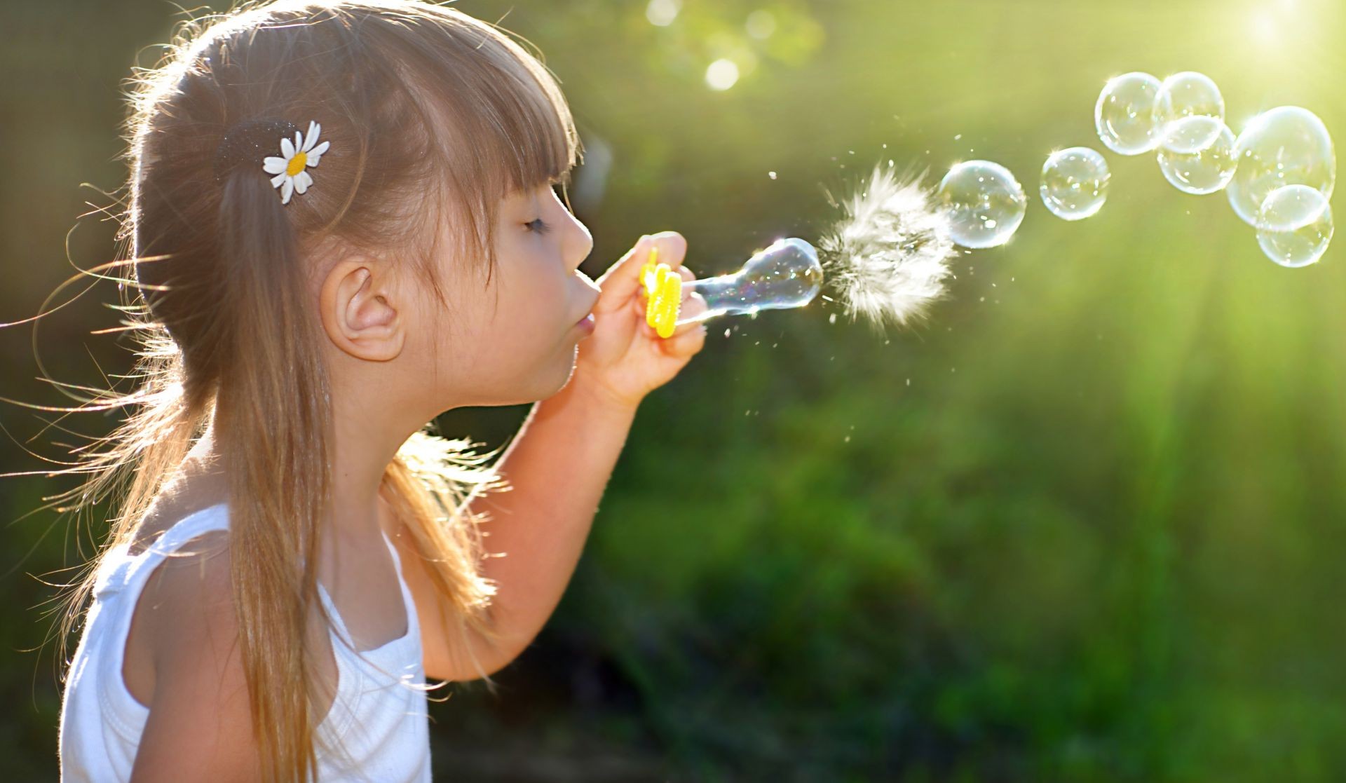 Mädchen mit Kamille im Haar lässt Seifenblasen Blasen