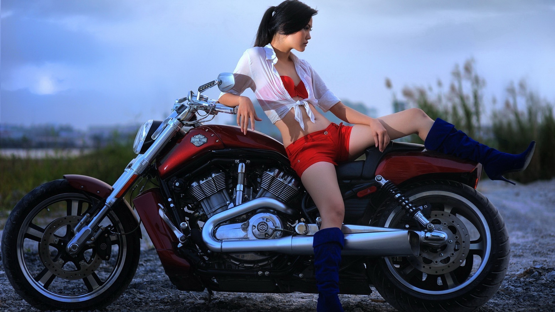 Fantastisches Mädchen auf einem Motorrad auf einem Sonnenuntergang Hintergrund