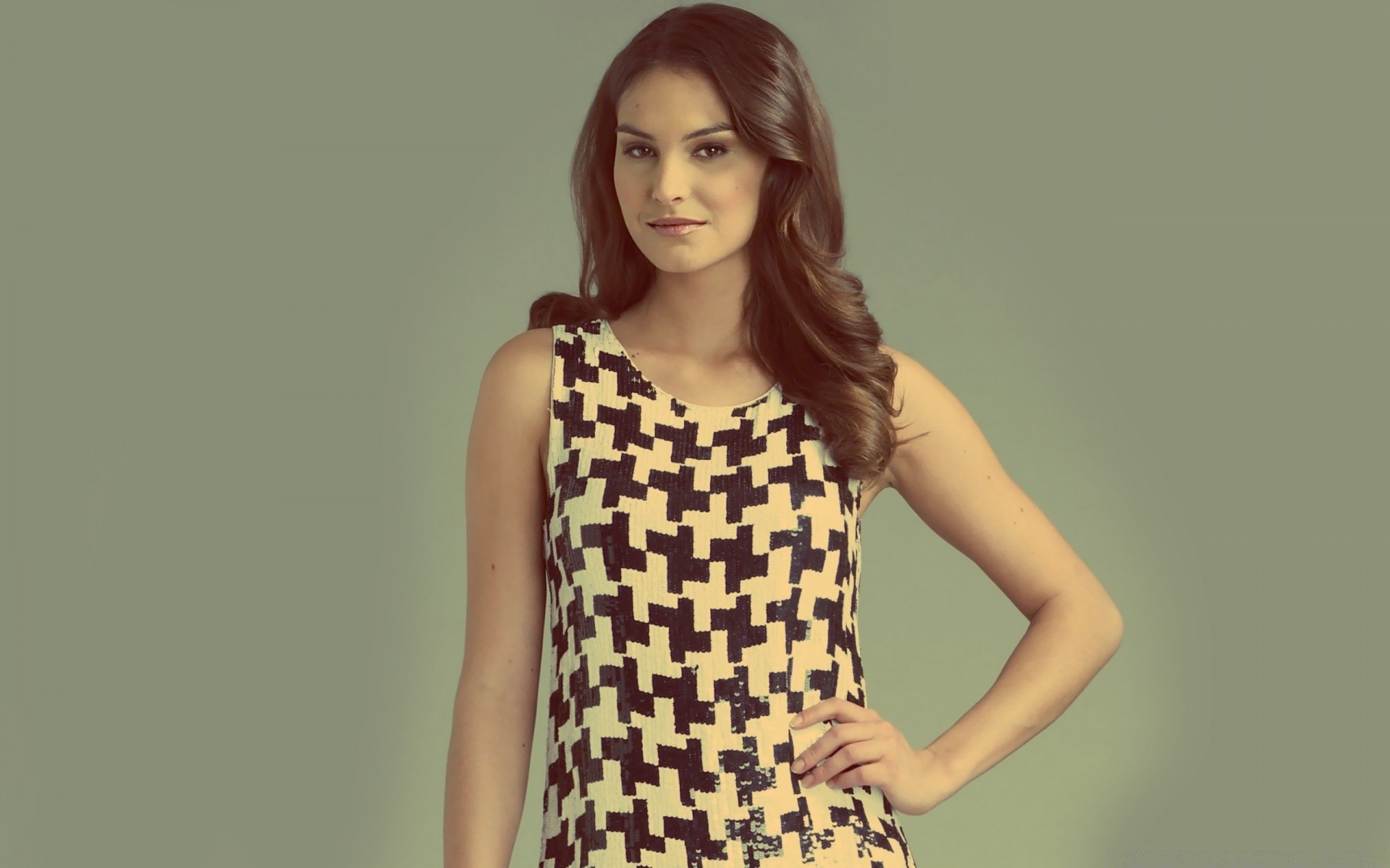 Schauspielerin im roten Kleid auf weißem Hintergrund