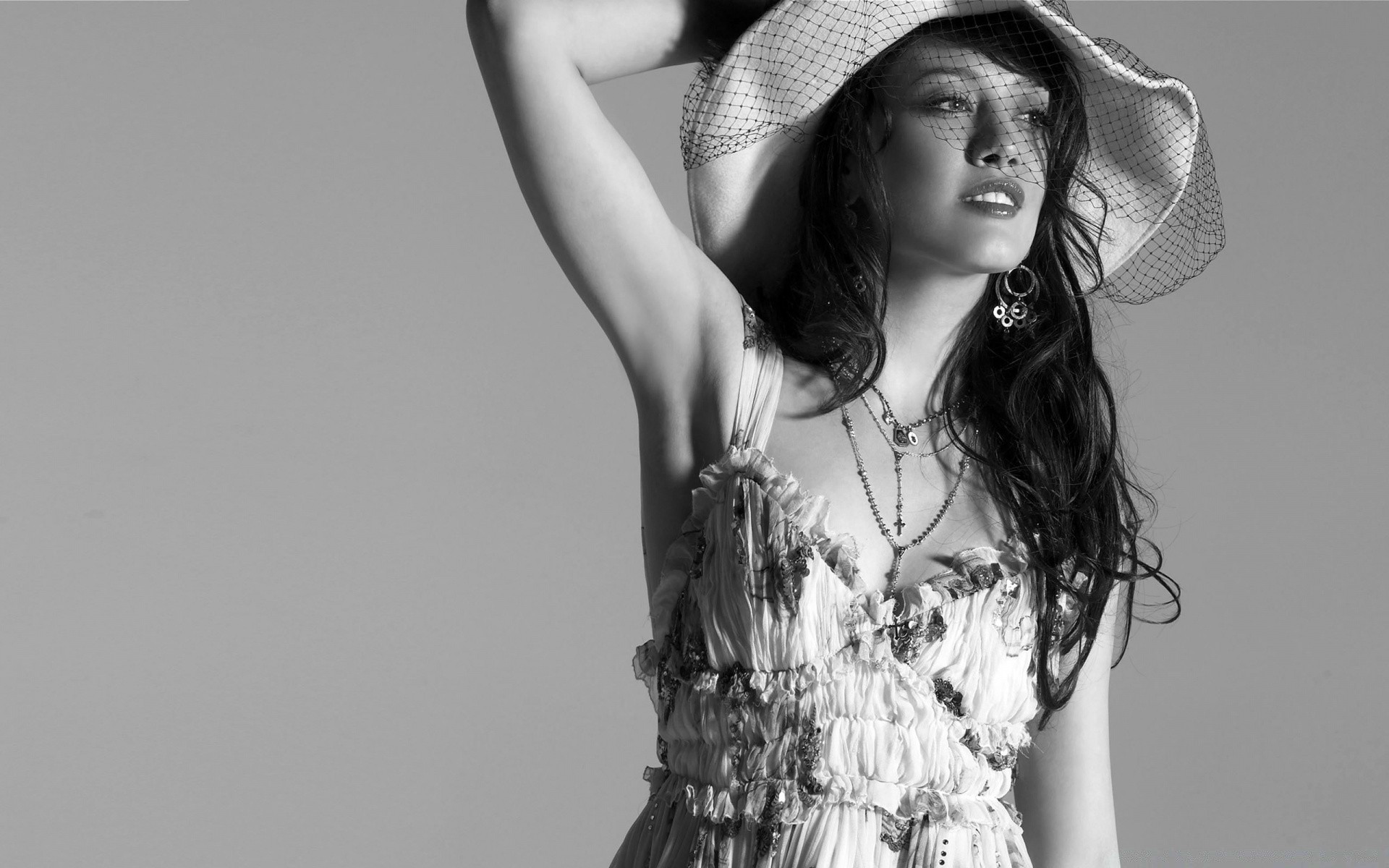 Brünette mit Hut und Kleid auf grauem Hintergrund