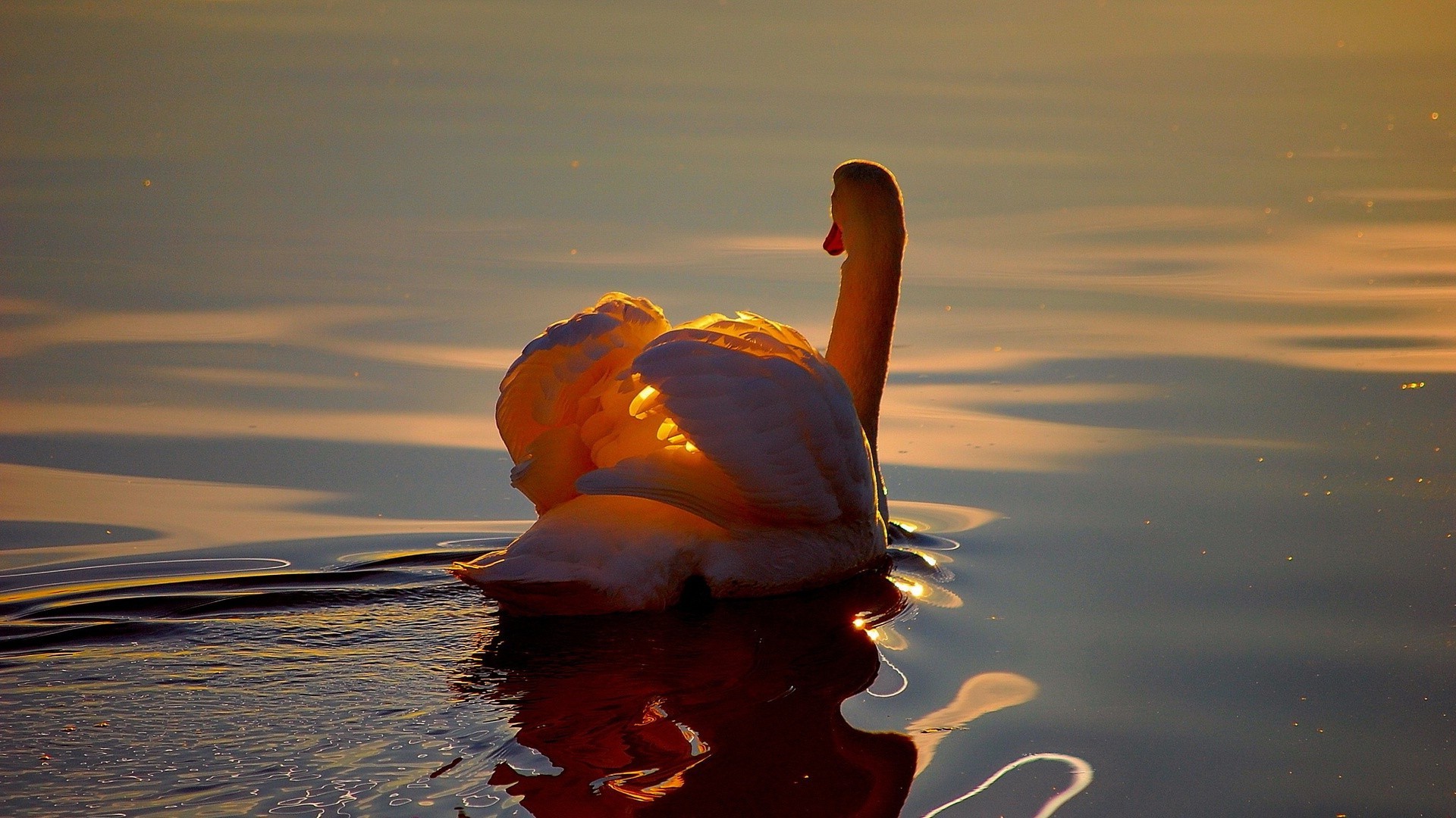 Ein weißer Schwan schwimmt im Sonnenuntergang