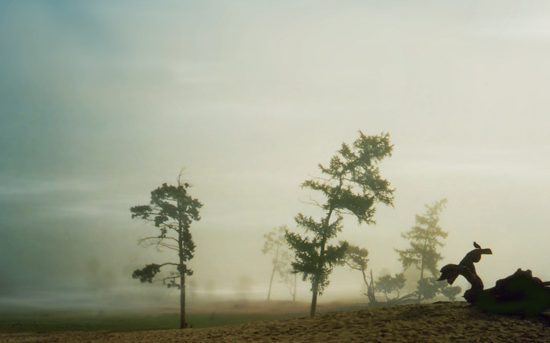 Bäume im Nebel vor dem Hintergrund der Dämmerung