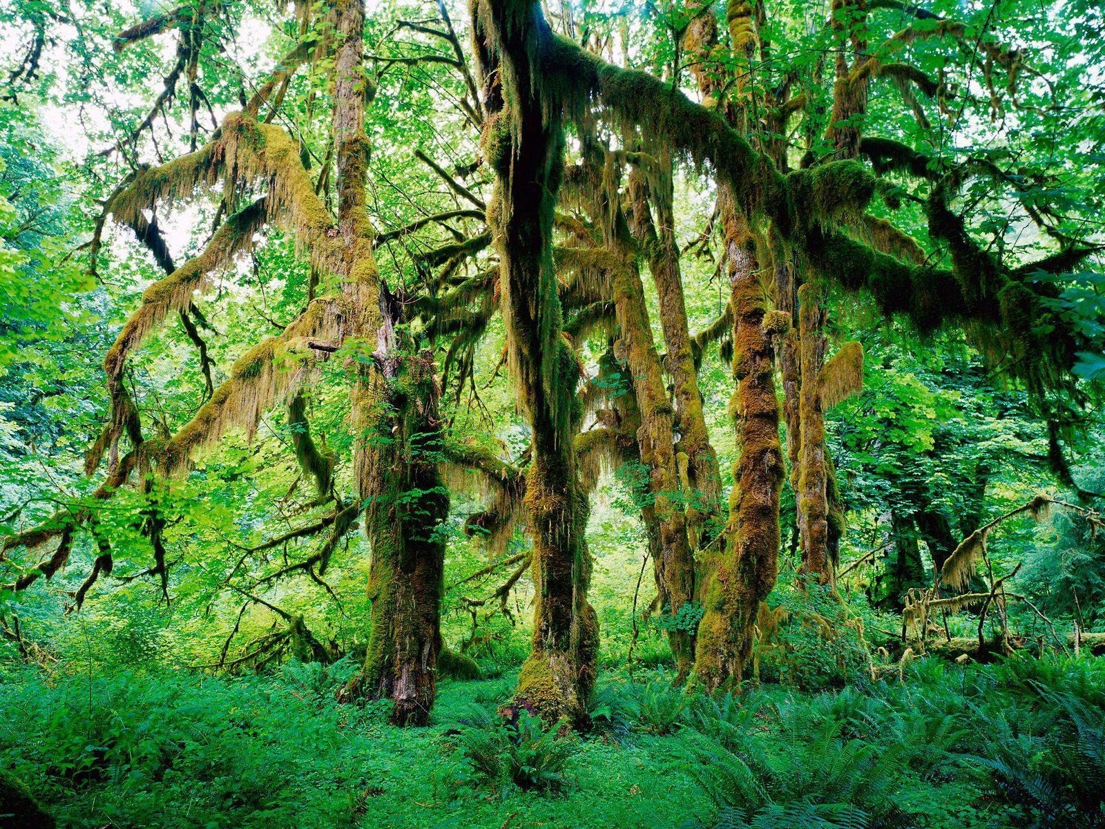 Die Sonnenstrahlen, die sich durch die Baumkronen bewegen