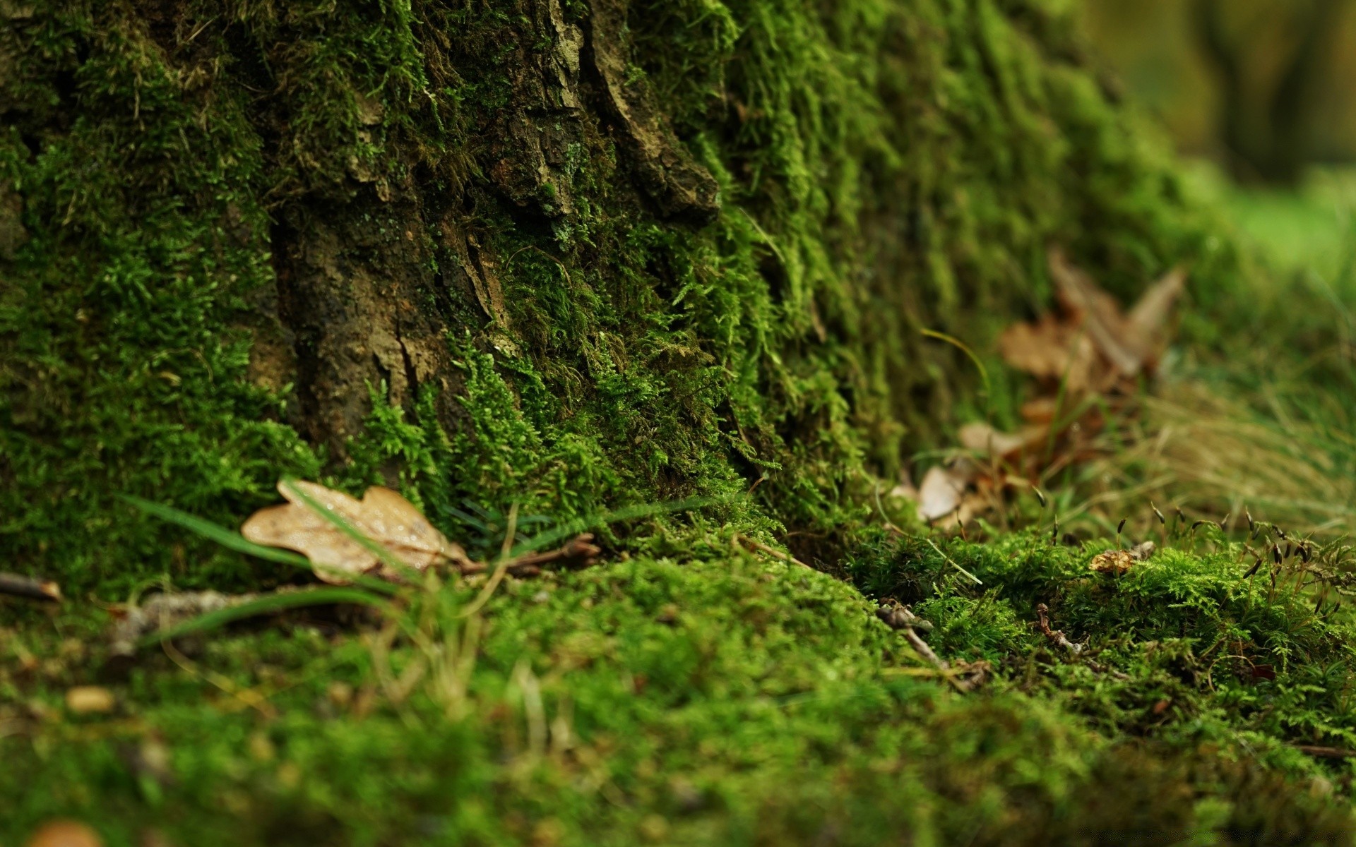 Laubfall auf grünem, flauschigem Moos