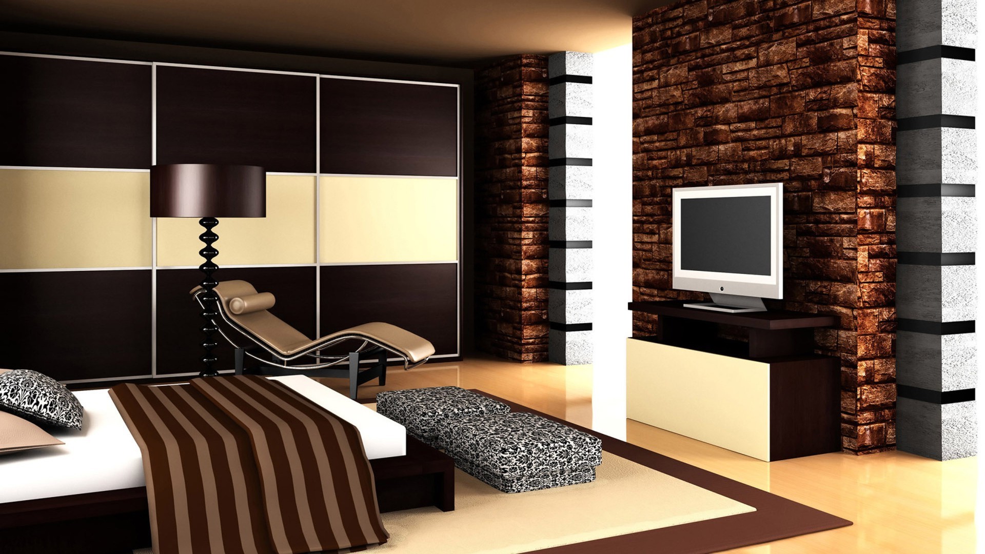 Zimmer mit Möbeln, Stehleuchte und Zimmerpflanze